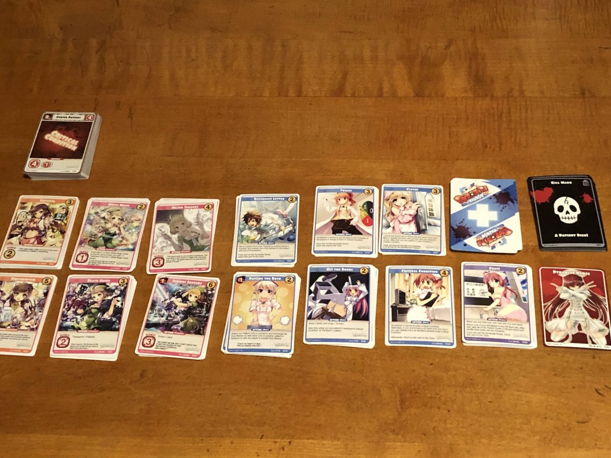 Deck building games often play best with two players. However, Dynamite Nurse plays three to five players. I do understand the reasoning behind requiring at least three players, but it’s also limiting. My guess is it’s due to the assignment of the patients, but maybe it could be randomized by flipping a coin or rolling a die.