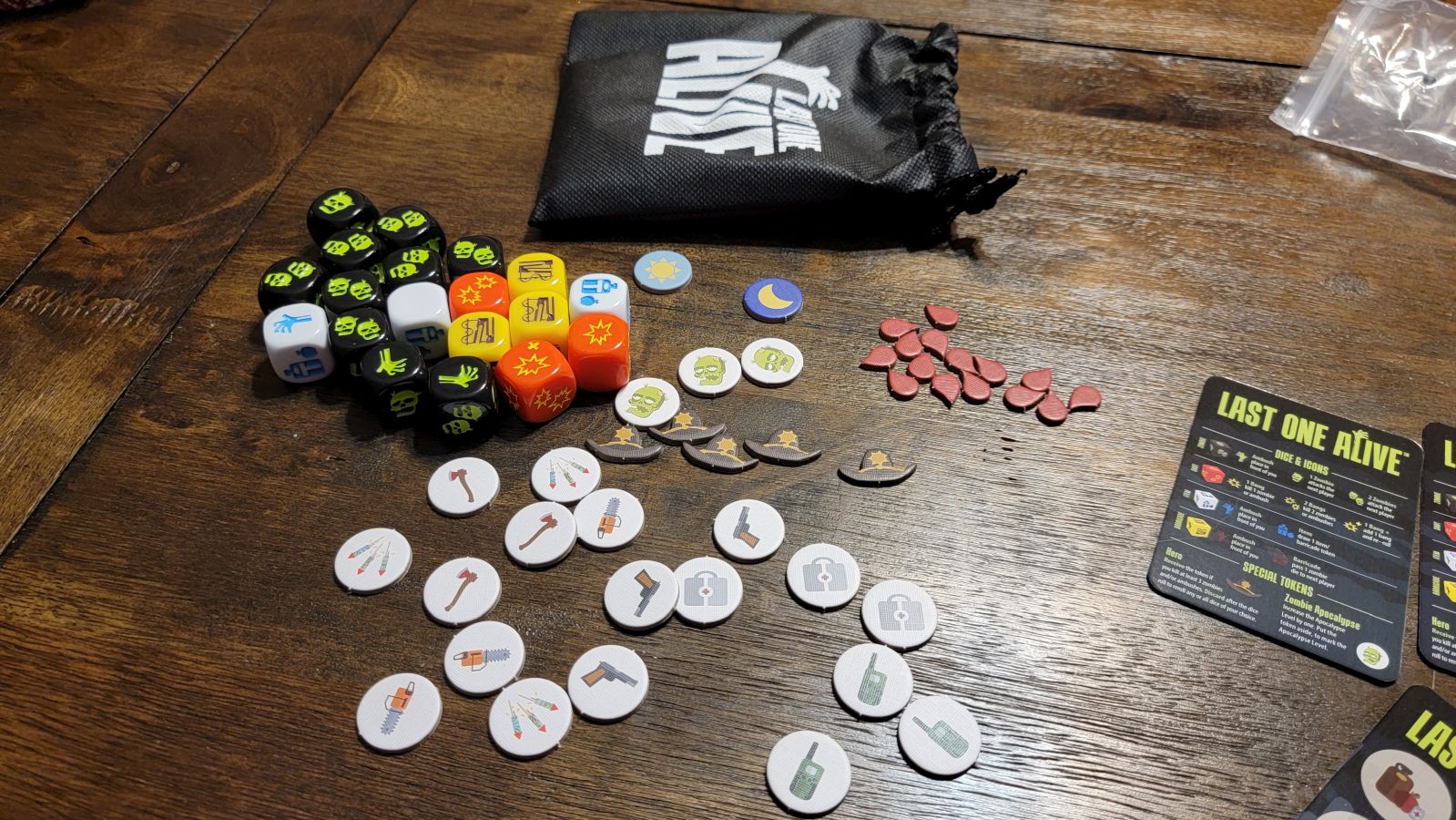 Quick to learn and play, Last One Alive is small in size and can be played on nearly any surface using the box for the dice rolls, making it ideal for trips or to take to a friend’s house. All that is needed for a round of Last One Alive is 19 dice, 10 cards, and 26 tokens (if playing with 5 players, less otherwise), although there are a few more pieces included for variants of the game including an additional 17 tokens.