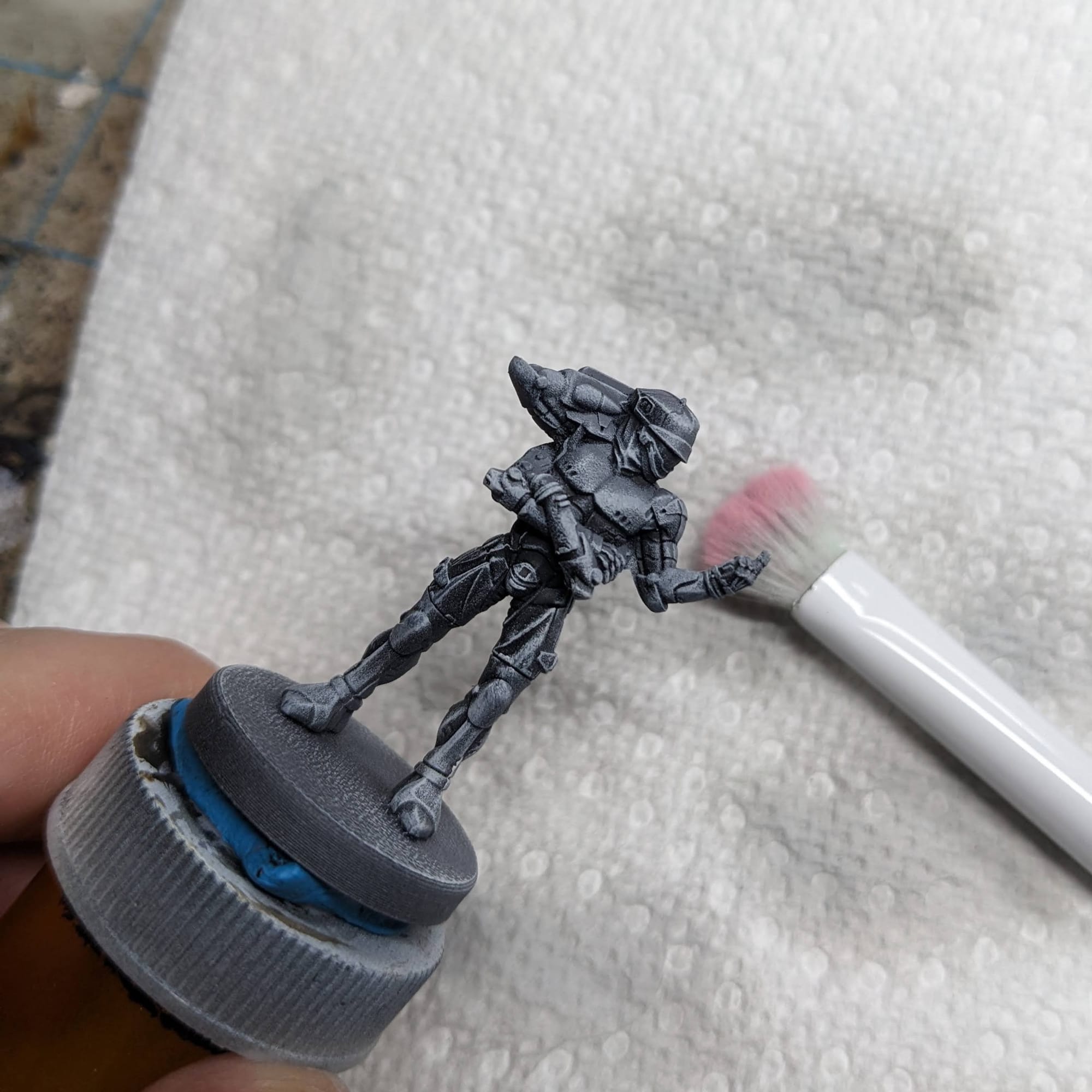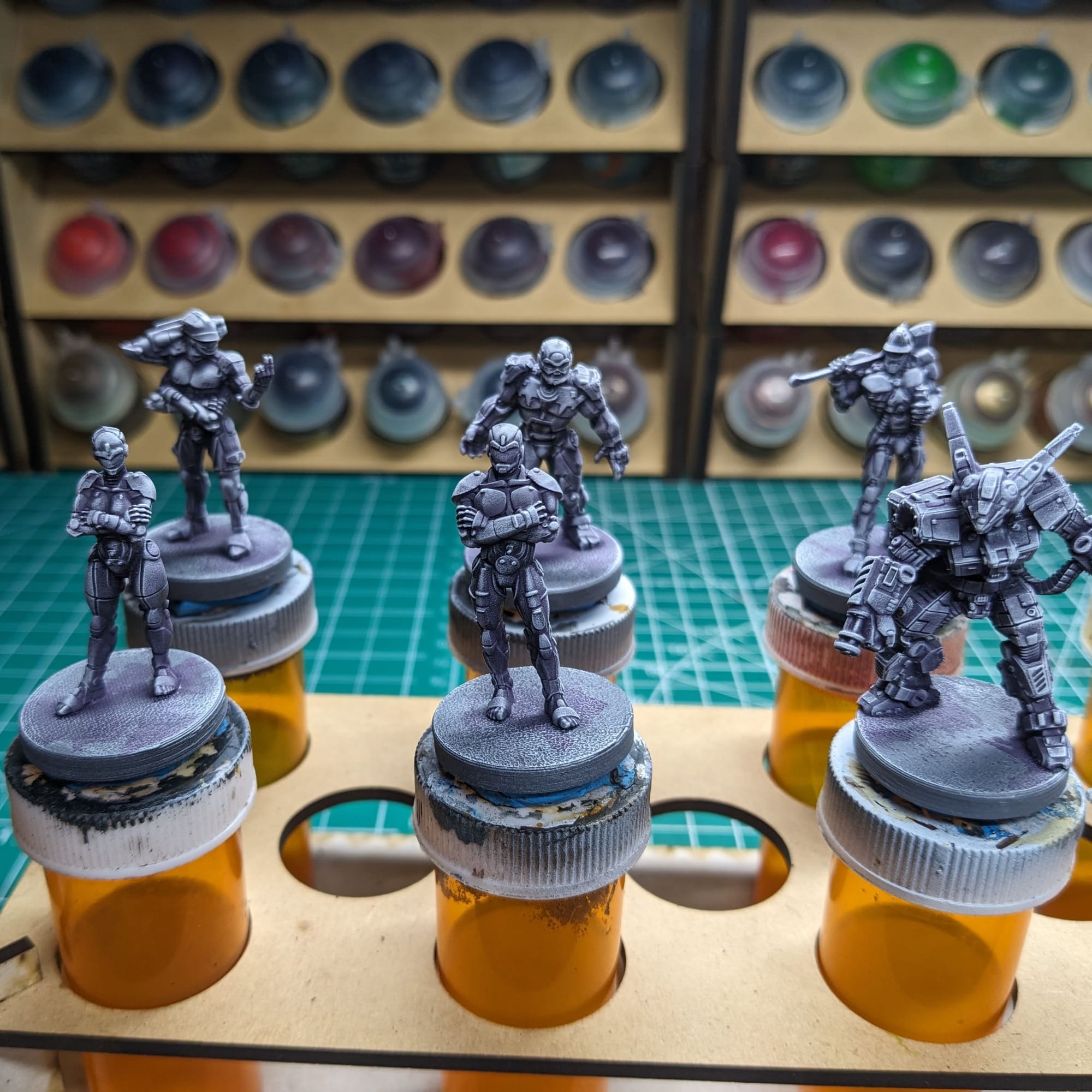 After I finish priming models, I affix them to some large medicine tubes with some double-sided tape or poster tack. There are official miniature holders and handles out there, but I just use these since they’re cheap, and sometimes I need multiple holders for batch painting. Paint holders allow me to easily handle the models so I can turn the models freely to get a good angle to paint certain parts or areas, as well as prevent hand cramping.
