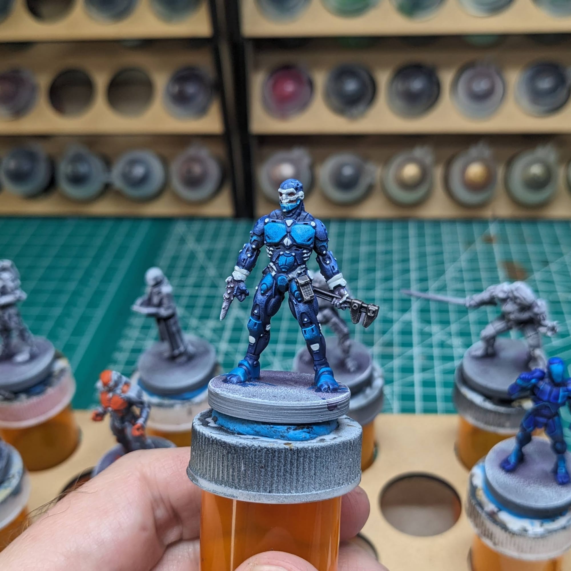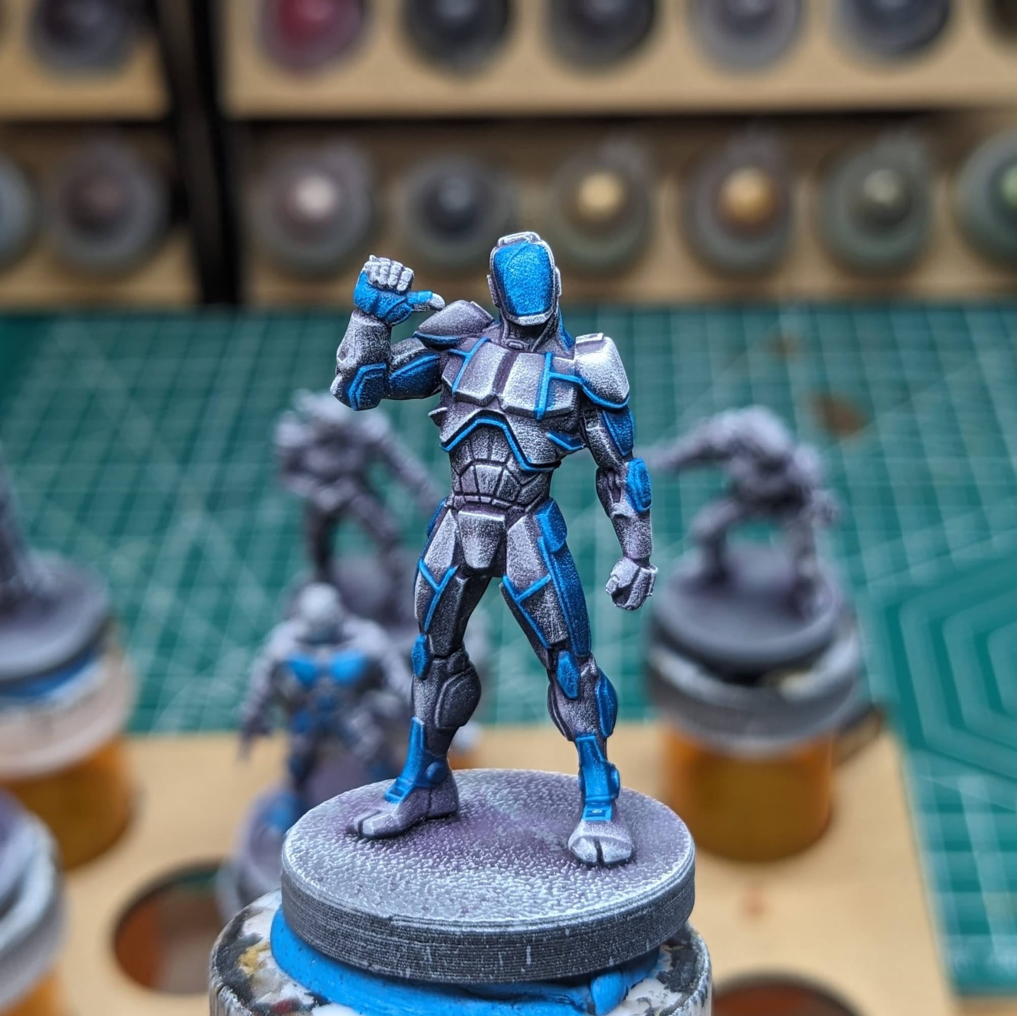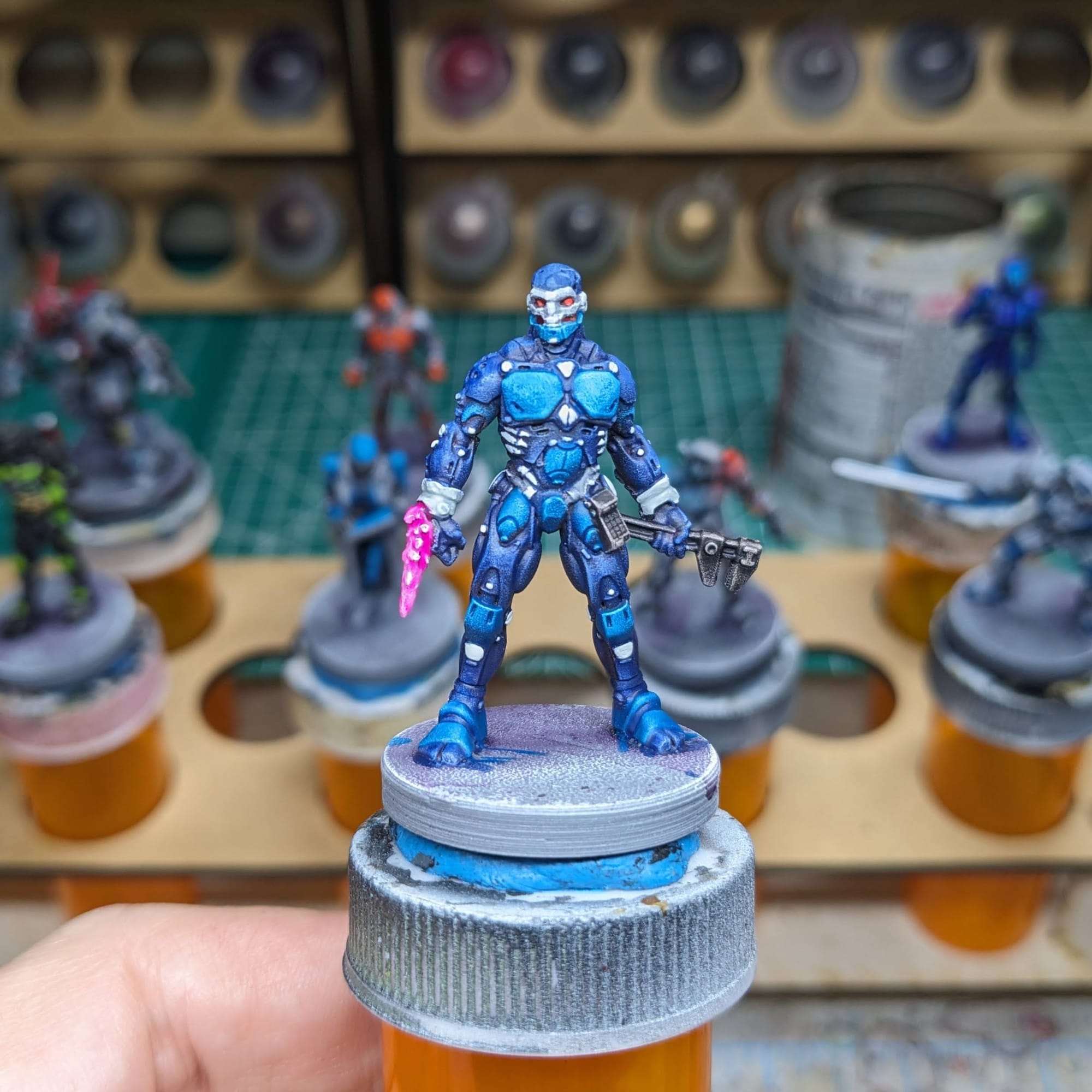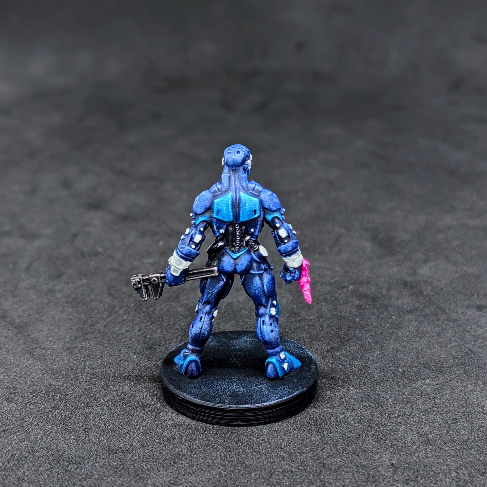 With how simple these poses are, and the way that they were sculpted, painting them was very quick and easily. Using the Slapchop method, I could accent and highlight the models appropriately to allow for a single pass of the speed paints/contrast paints. I used minimal paints to go back and add glowing eyes, edge details, and/or accents, allowing the shadows, midtones, and highlights to be predominant come through with the single coat of paint. Using the silver/black Slapchop method would have also worked for this process, and if I paint more FBCs I might try that out.