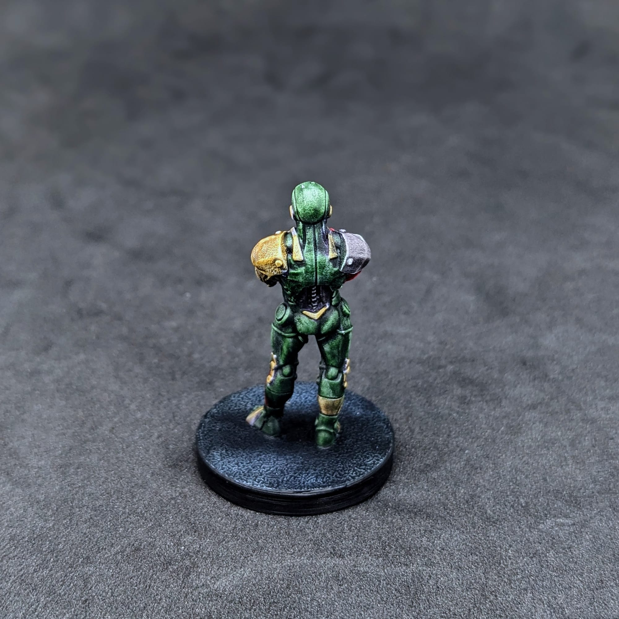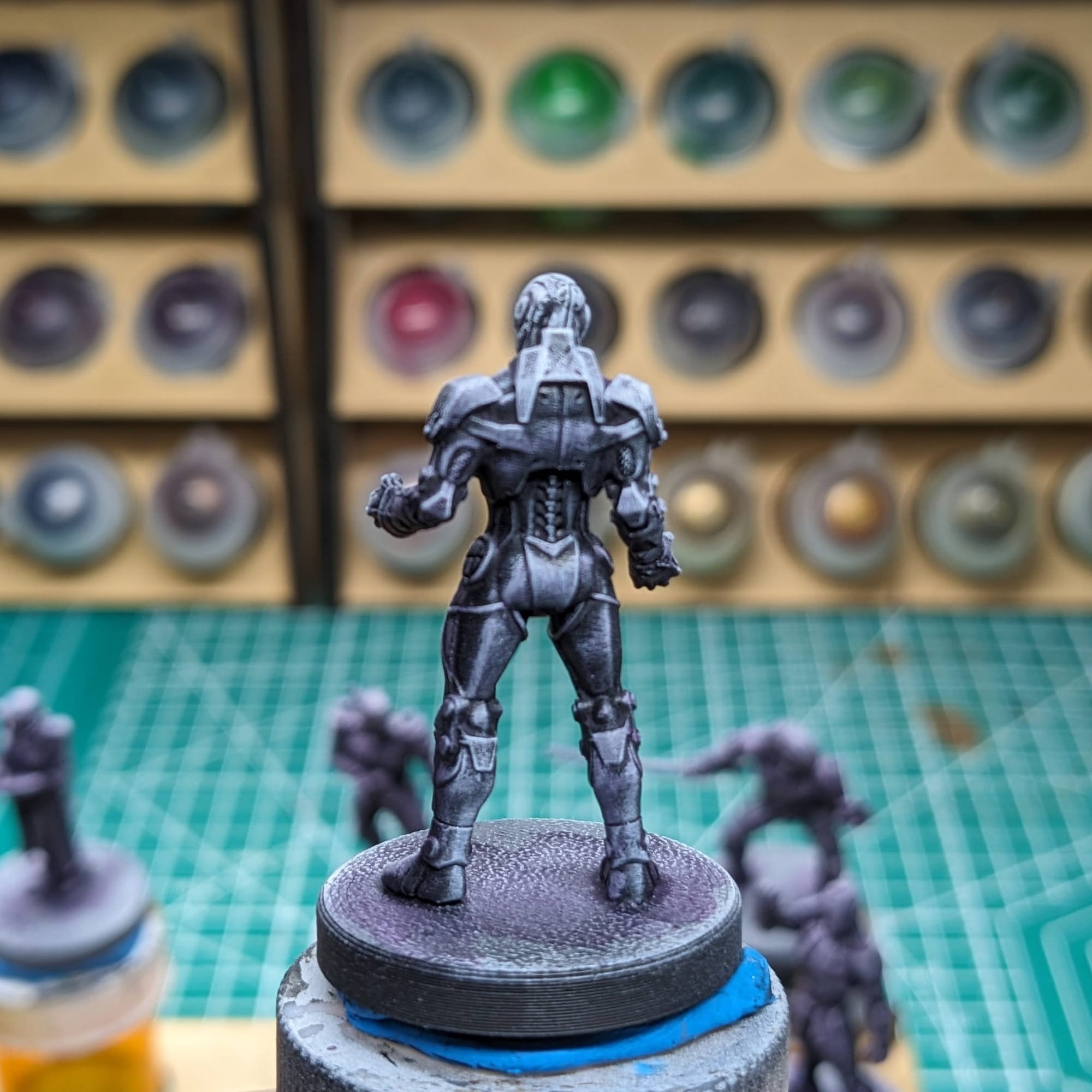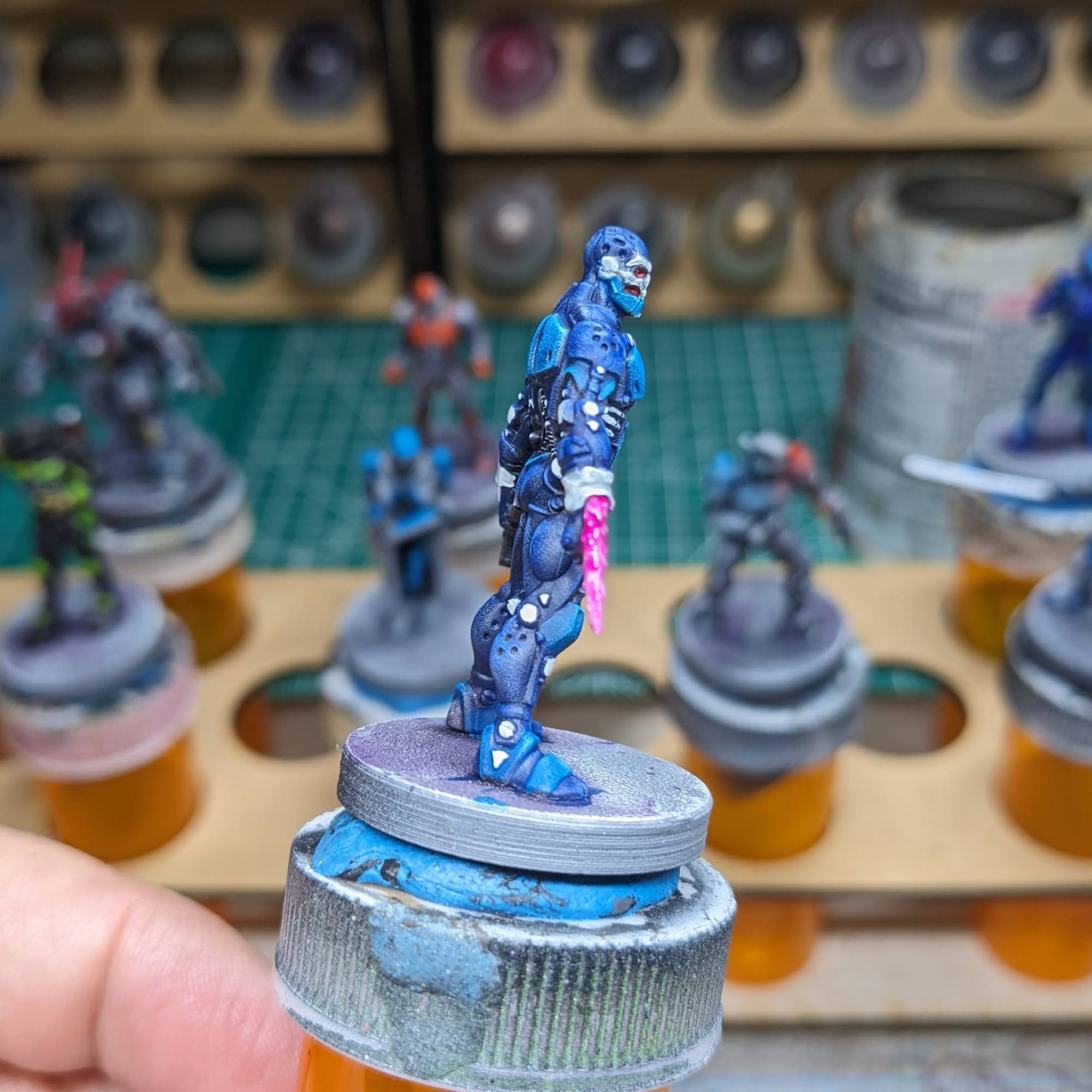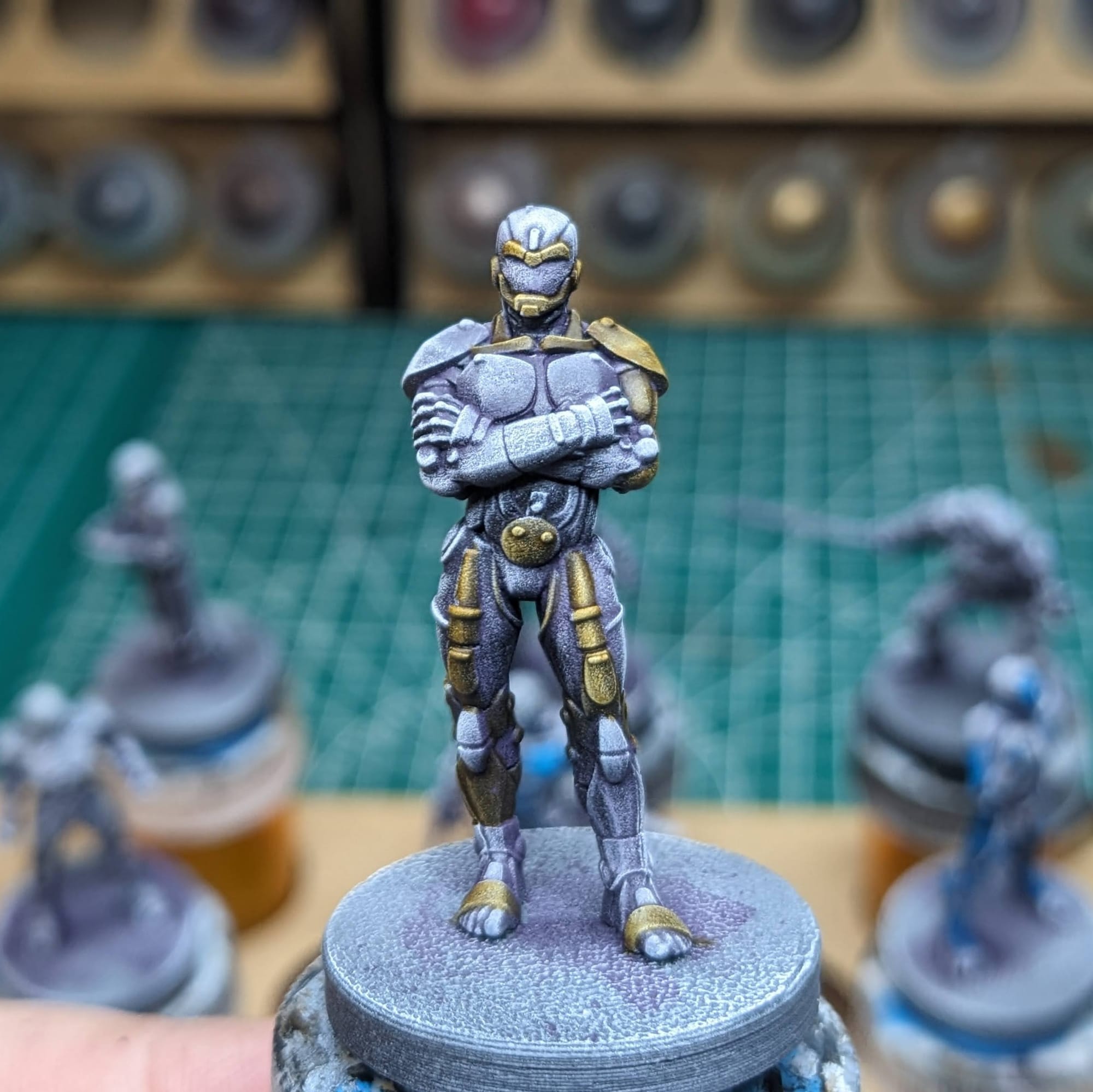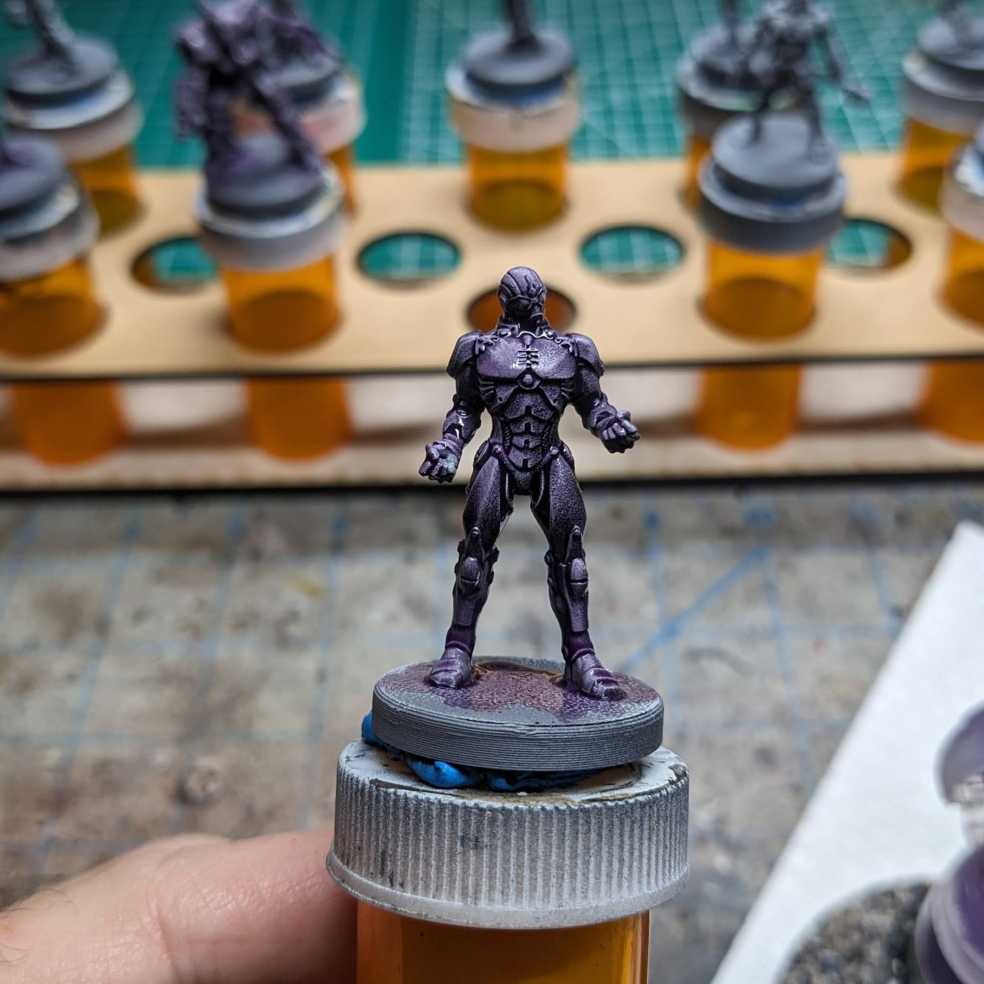 With how simple these poses are, and the way that they were sculpted, painting them was very quick and easily. Using the Slapchop method, I could accent and highlight the models appropriately to allow for a single pass of the speed paints/contrast paints. I used minimal paints to go back and add glowing eyes, edge details, and/or accents, allowing the shadows, midtones, and highlights to be predominant come through with the single coat of paint. Using the silver/black Slapchop method would have also worked for this process, and if I paint more FBCs I might try that out.