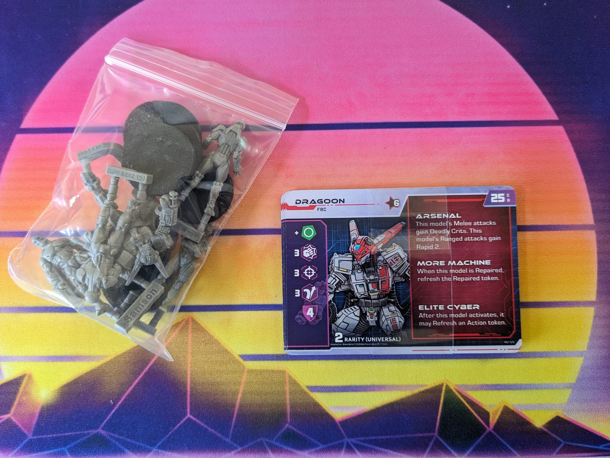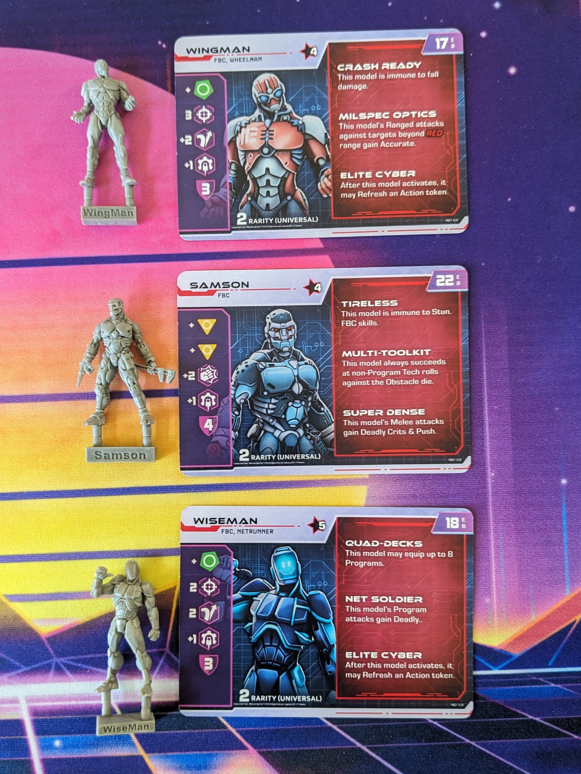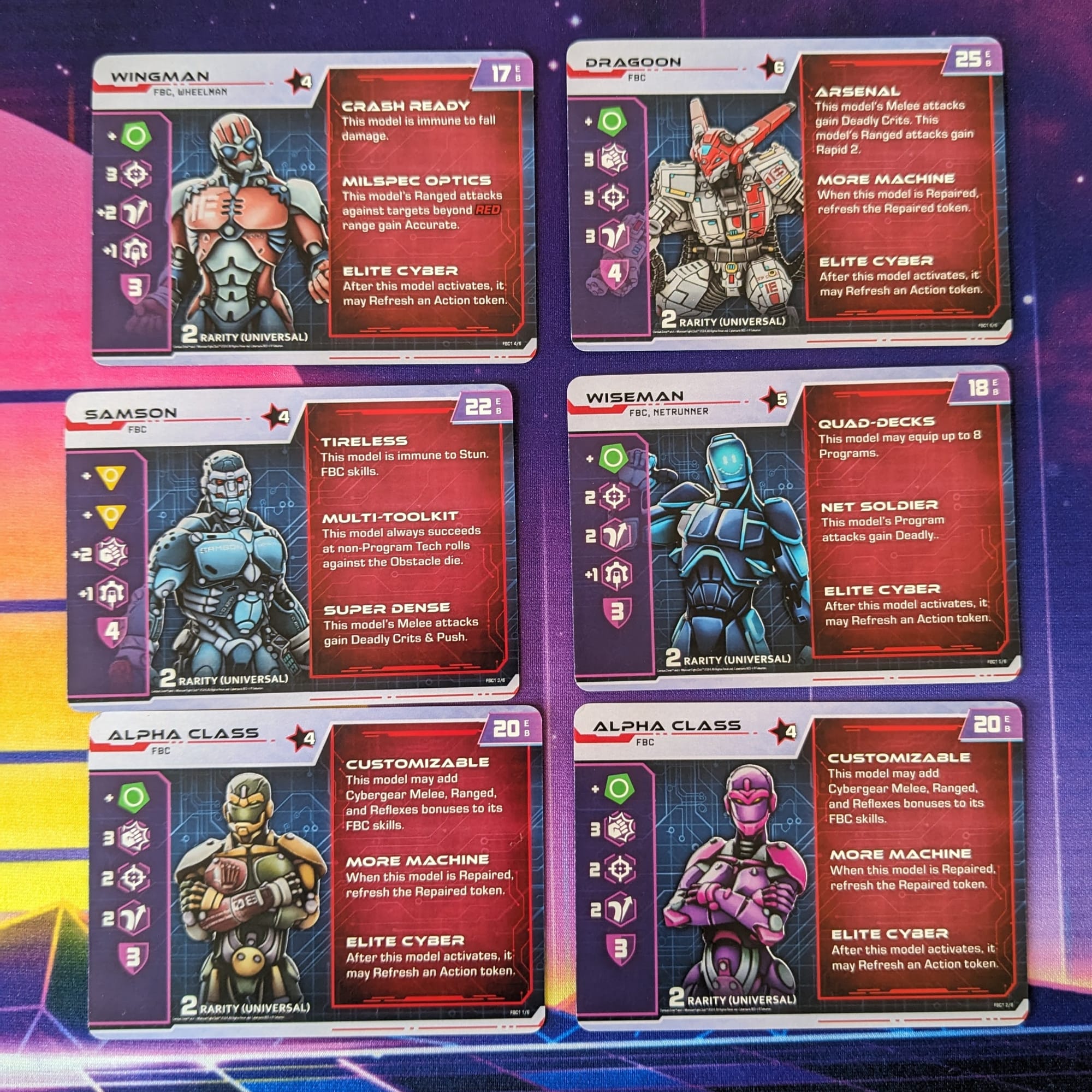 The box includes the six figures, six bases, and six corresponding cards. The sculpts match the card art, but if you're not sure which is which, the model's sprue has their name printed on them. The landscape-oriented cards are a good design, because the FBCs attach to an individual model, adding more abilities and stats.
