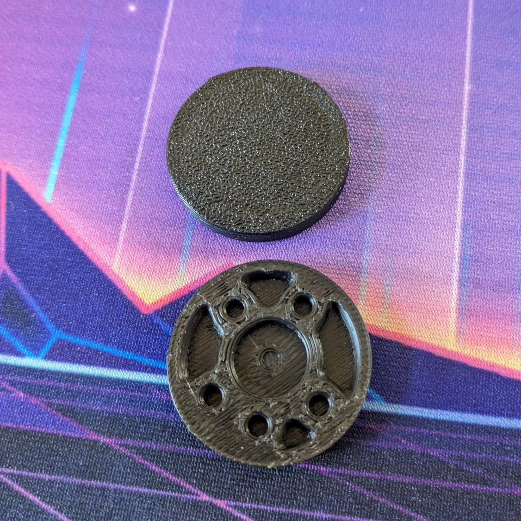 For the Cyberpunk theme, I wanted to keep the basing basic. The 3D printed texture on the base is pretty close to asphalt or grimy concrete, so I just did a little bit of dry-brushing of Citadel Stormfang, although any gray or dark blue would work here. You can also add in road markings, or designs from warehouse or loading zone, or even just leave it black. You can also apply texture paints if you wanted. More often than not I do the basing at the very end because, and you can see from the Contrast paints, paint tends to get on the base.