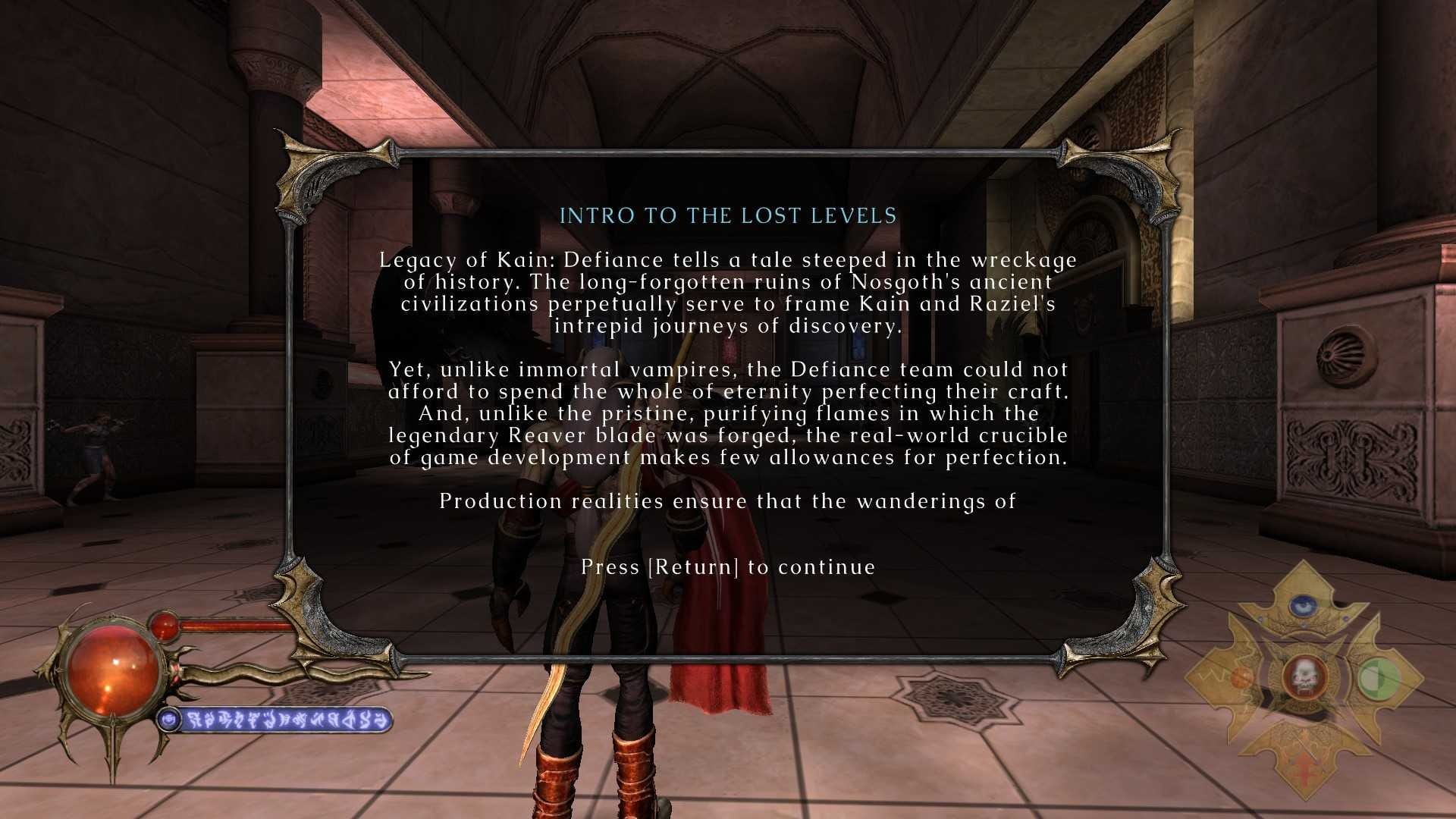 A well-written story is only as good as the voice actors that bring it to life, and Defiance is arguably the series at its best. Simon Templeton's performance as Kain hits a fever pitch of malevolence, and Michael Bell's slow realization of his role to play as Raziel is masterful, with both delivering arguably the best these two legends have to offer. If you were inclined to read the script in its entirety, it's available in the game as an extra. This was something the remaster of the first two games did as well, as well as Lost Levels you can experience for yourself (more on that in a moment), but the list of goodies available for the super fan is absolutely absurd here.