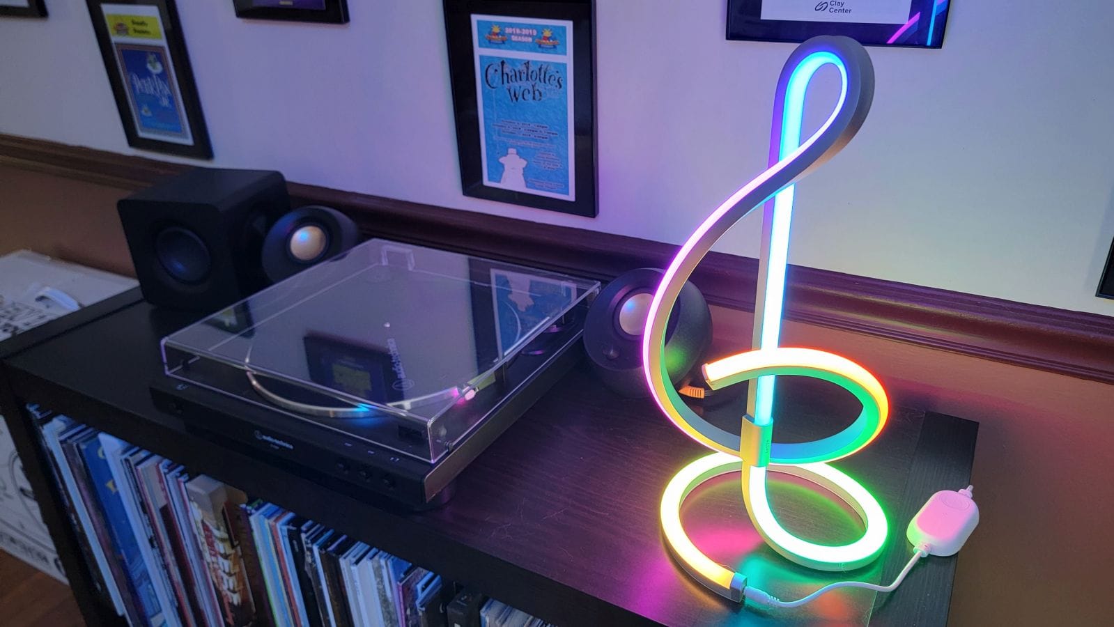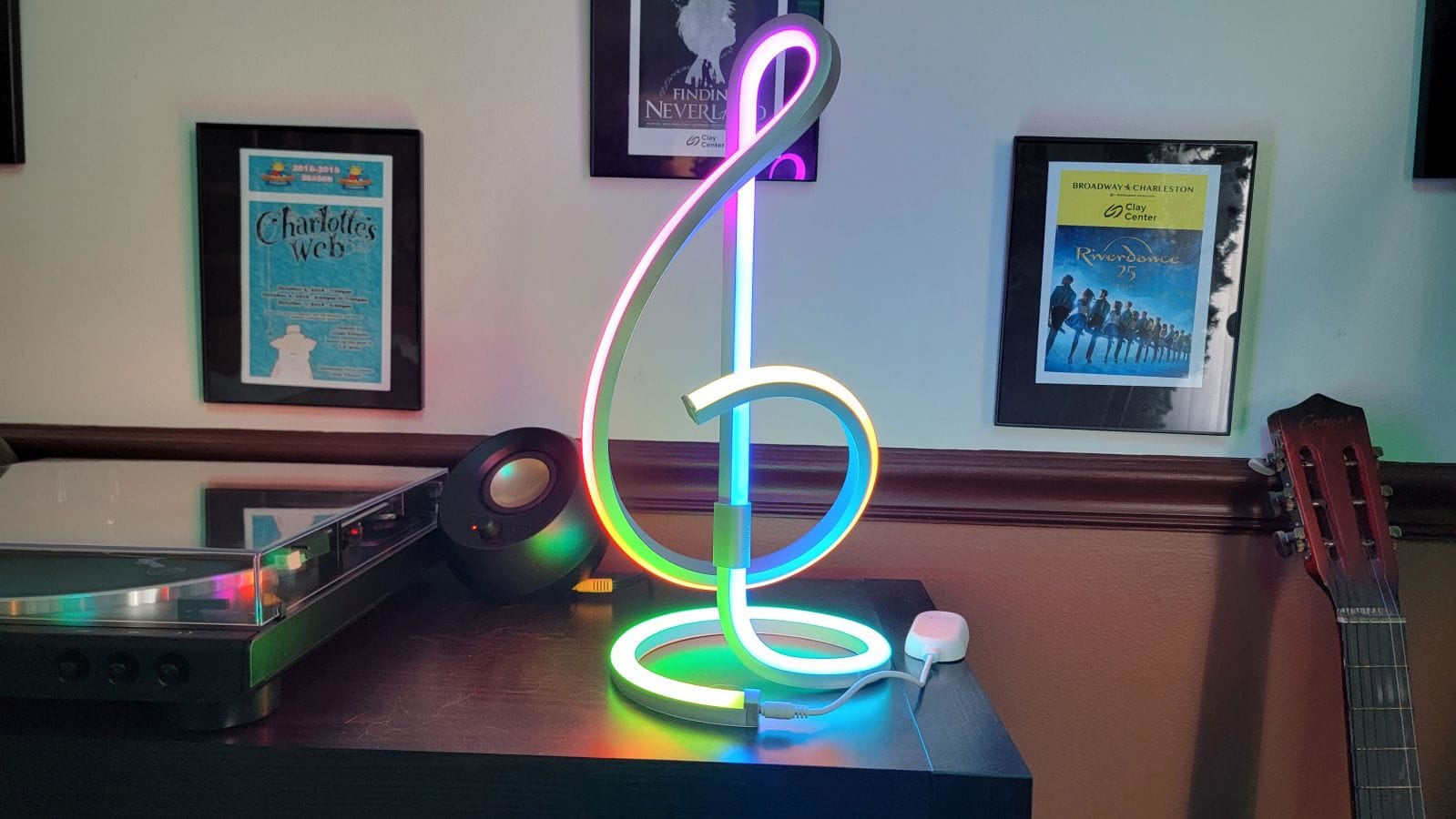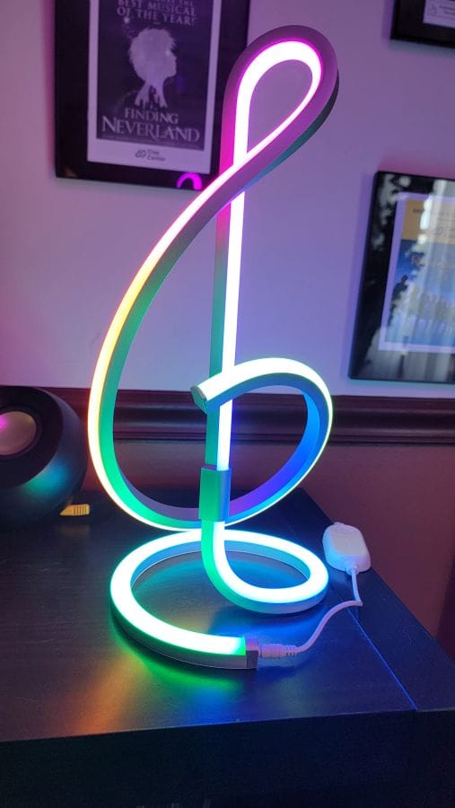 Lepro currently has two of these table lights available, but I picked up the TB2, which is shaped like a treble clef musical note, allowing it to blend in perfectly with the music nook in my house. The TB2 stands 15.7” tall and 7.4” wide, features 152 RGB+IC customizable LED lights, voice control via Alexa or through Lepro’s app, AI which can choose lighting effects based on voice prompts, the ability to sync to music, and the ability to create your own custom lighting patterns.
