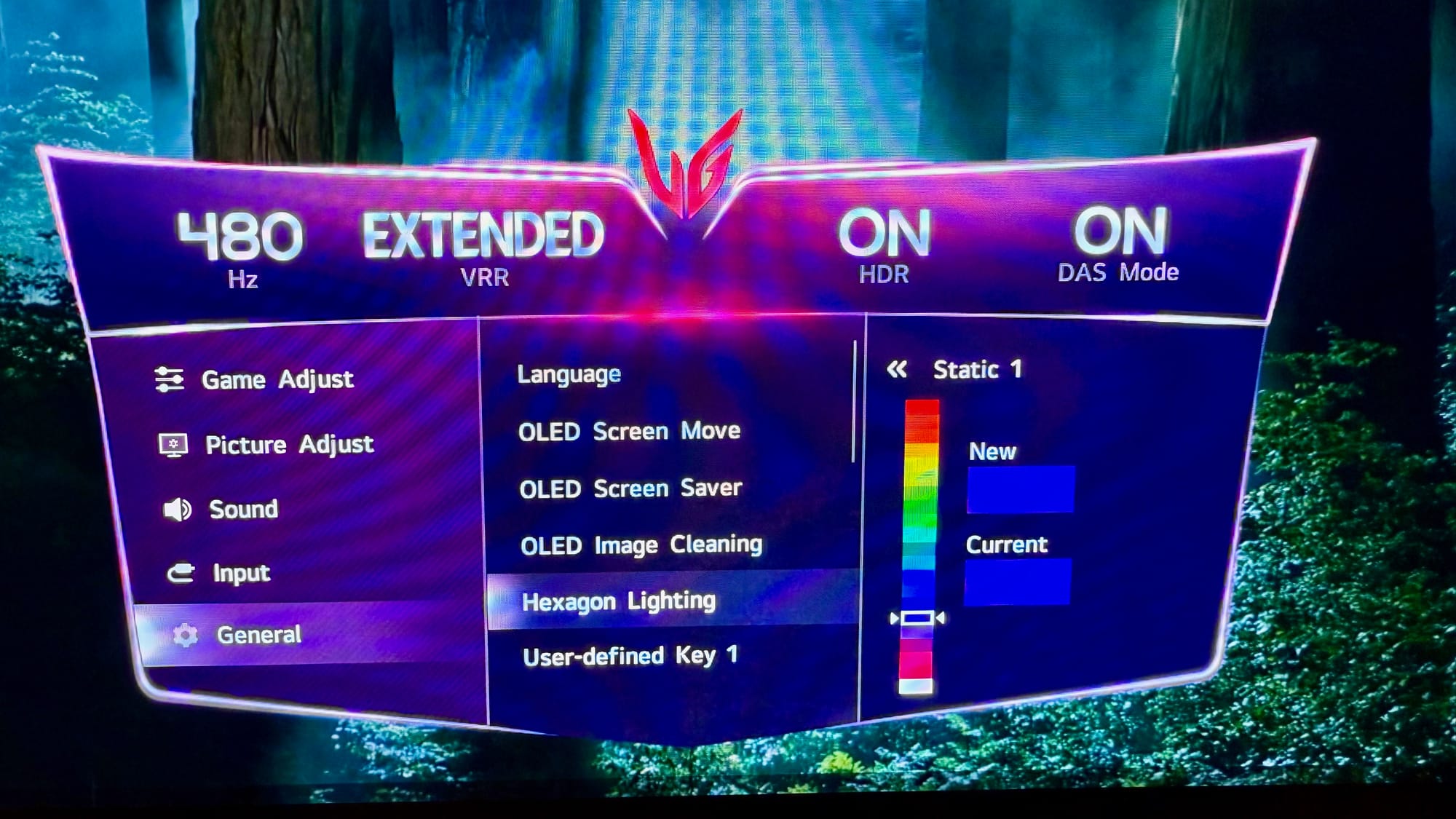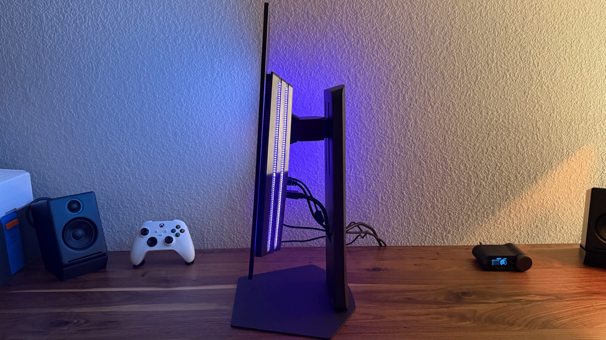 Finally, let's talk RGB! The hexagonal hump on the monitor's rear features lighting along four sides that illuminates behind the screen. While you won't find a traditional color picker with precise R/G/B value controls, there is plenty of choice between the static preselected colors or cycle mode to suit your aesthetic preferences.