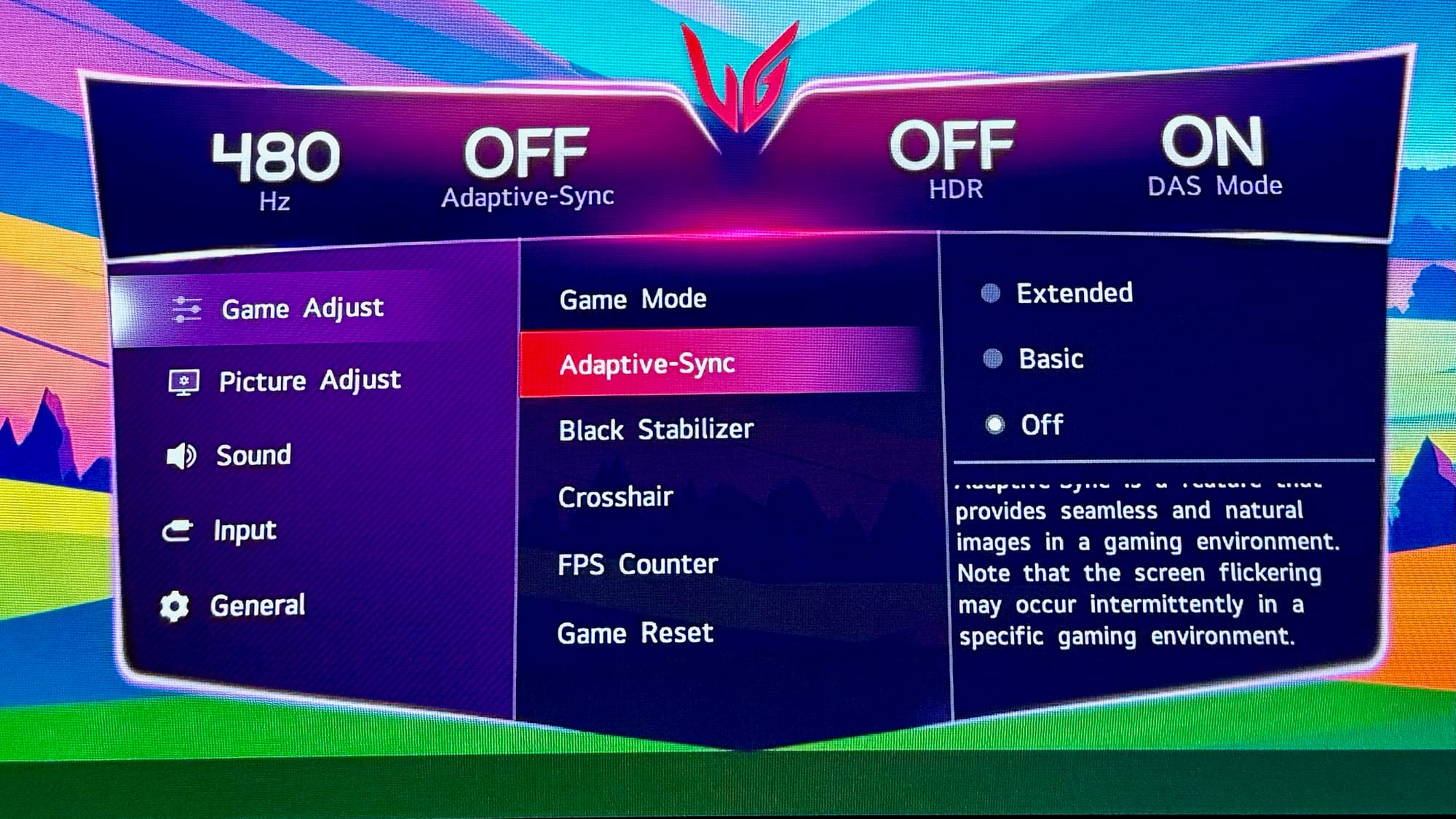 However, my experience with Adaptive Sync was unfortunately plagued by persistent flickering. LG acknowledges this potential issue in their on-screen menu noting that "Screen flickering may occur intermittently in specific gaming environments" but offers little insight beyond that vague warning. In my testing, enabling any mode of Adaptive Sync resulted in distracting flicker regardless of the game or its graphical settings. As you can see in the clip below demonstrating Tetris Effect, this makes gameplay almost unplayable—and I ultimately had to disable Adaptive Sync entirely for a stable experience, which is unfortunate given its intended benefits.