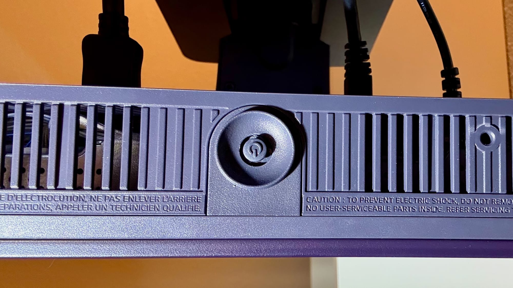 Connectivity options include power input, two HDMI ports, DisplayPort, dual USB in-ports for peripherals, as well as an out port acting as a hub. There's also a 3.5mm audio jack tucked away on the bottom left. It creates something of a tail that alters the monitor's profile slightly when plugged in. It's not ideal for long term use, but it is nice to note that plugging headphones in prompts an informative message: "Your headphones are connected. To use microphone, connect the monitor to your computer with a USB cable" acknowledging and enabling microphone passthrough functionality.
