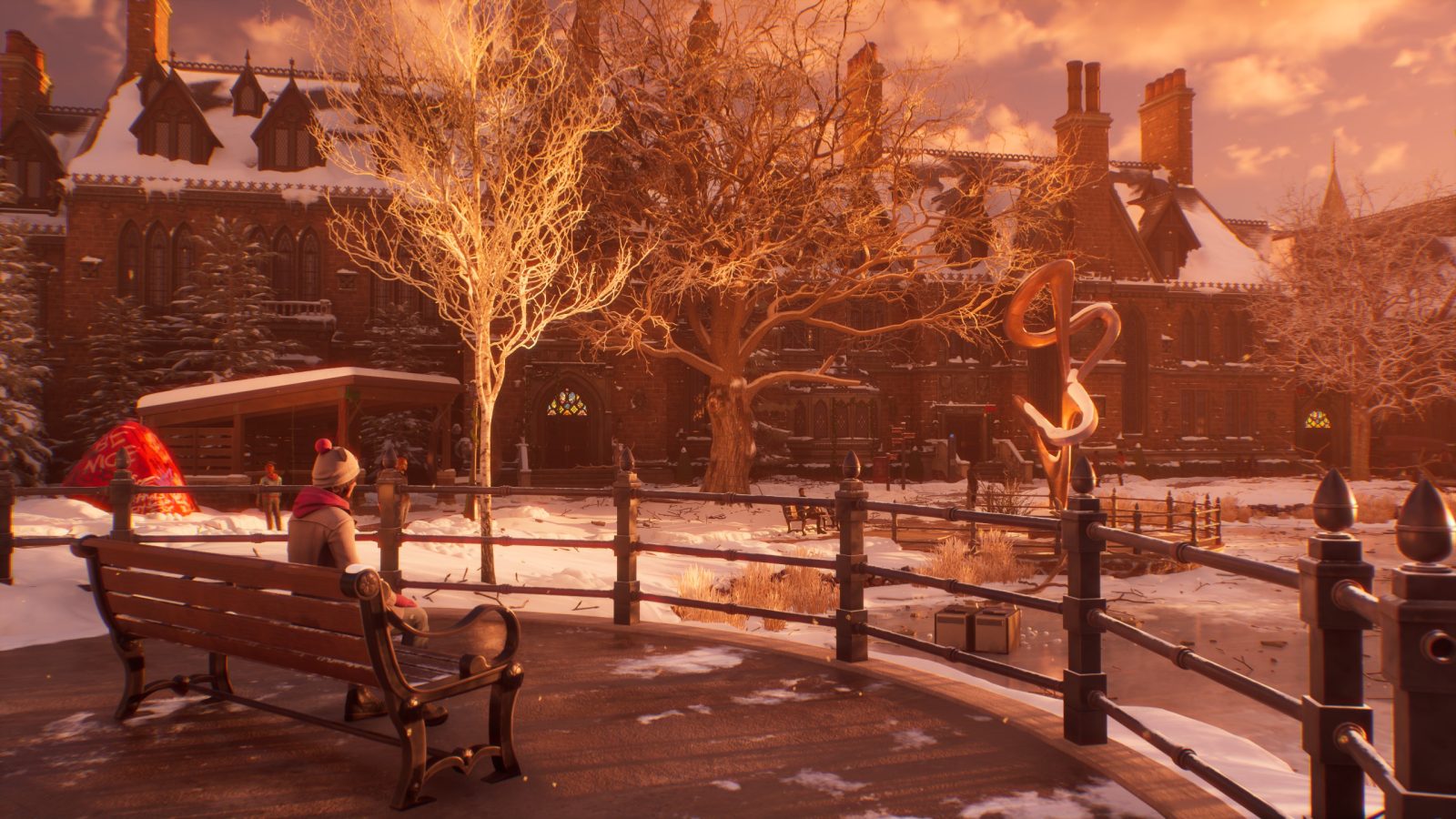 Visually speaking, this latest entry is absolutely gorgeous, and easily the best the series has ever looked. Life Is Strange has always excelled at conveying a quiet, reflexive nostalgia with visually absorbing scenery, and Double Exposure is no exception. Strolling through Caledon’s campus means taking in the serene winter vibes, seeing the various things the students have built in the snow, or a student who is always ice skating on a pond. This is juxtaposed by the interiors of the school, with each room being decorated with projects and awards from students and staff. The work being done while in school, versus the play when enjoying the winter snow. Yet the visual still manages to blend these two primary atmospheres, primarily with the holiday decorations in the buildings, and the students enjoying warm beverages to warm up after trekking through the blanket of snow.