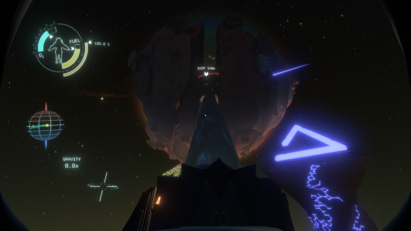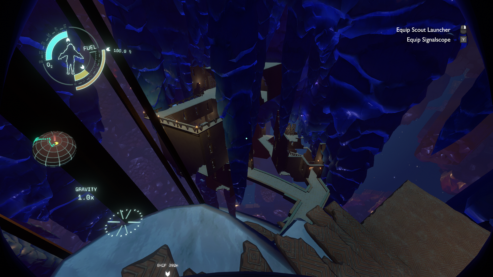 Outside of the ship, where players will need to be in order to explore planets and/or repair the ship, players are outfitted with a few simple, tools: their trusty spacesuit with its rocket thrusters and limited oxygen and fuel, a probe gun to scout areas among other things, a translator for Nomai text, a flashlight, and a signal detector. It’s through this small selection of basic tools that the player interacts with the world. Outer Wilds has top-notch level design and visual telegraphs; the environments help nudge the player towards the correct locations or solutions. It’s not a matter of unlocking the proper upgrades and traditional forms of progression, the game promotes lateral thinking—using what players already have at their disposal to interact with their environments in ways they had not thought possible, informed by other locales and obstacles they may have visited prior. Save for a few (very forgiving) time-sensitive endeavors, there’s no reason to rush, and with the sheer number of exploratory prospects available at any given time, players are never made to feel in the wrong for marching to the beat of their own drum.