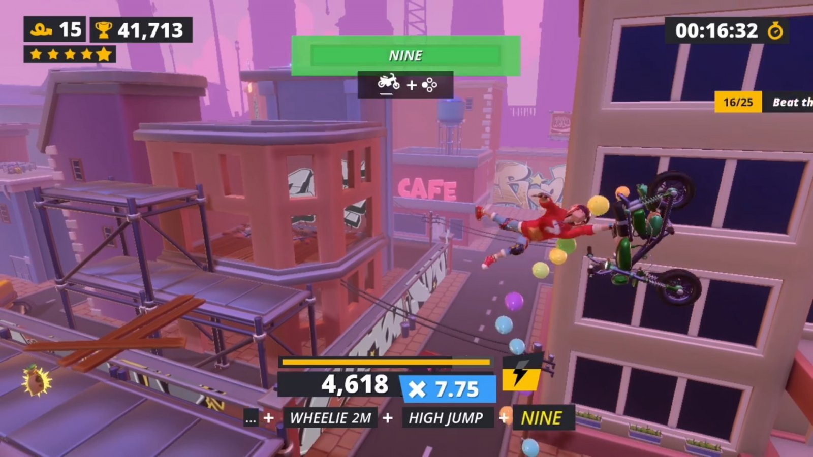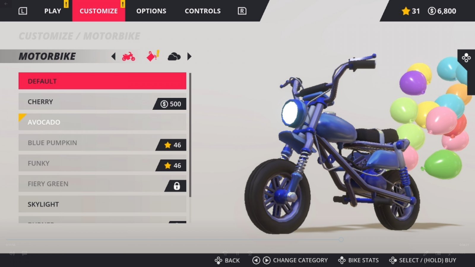 When playing, you’ll be able to accelerate, brake, reverse, and jump, along with performing a variety of tricks depending on what buttons you press. Pressing and holding X or Y while in the air, while performing a wheelie, or while performing a stoppie allows you to perform whatever trick is assigned to that button combination. You’ll also learn more complex button combinations to perform tougher tricks, such as pressing Y, then X, then holding Y, all in quick succession. These take some doing to master, but they’re totally worth it. You can change what tricks you can perform in the customize tab before starting a level, so choose what tricks seem most interesting to you. You can breakdance, do handstands, flip, and much more in order to rack up points and show off how skilled you are. Pressing A allows you to do a 180, which is the only way to turn around. You’ll be using that a lot when trying to rack up points in levels.