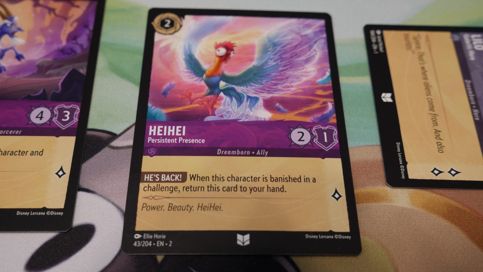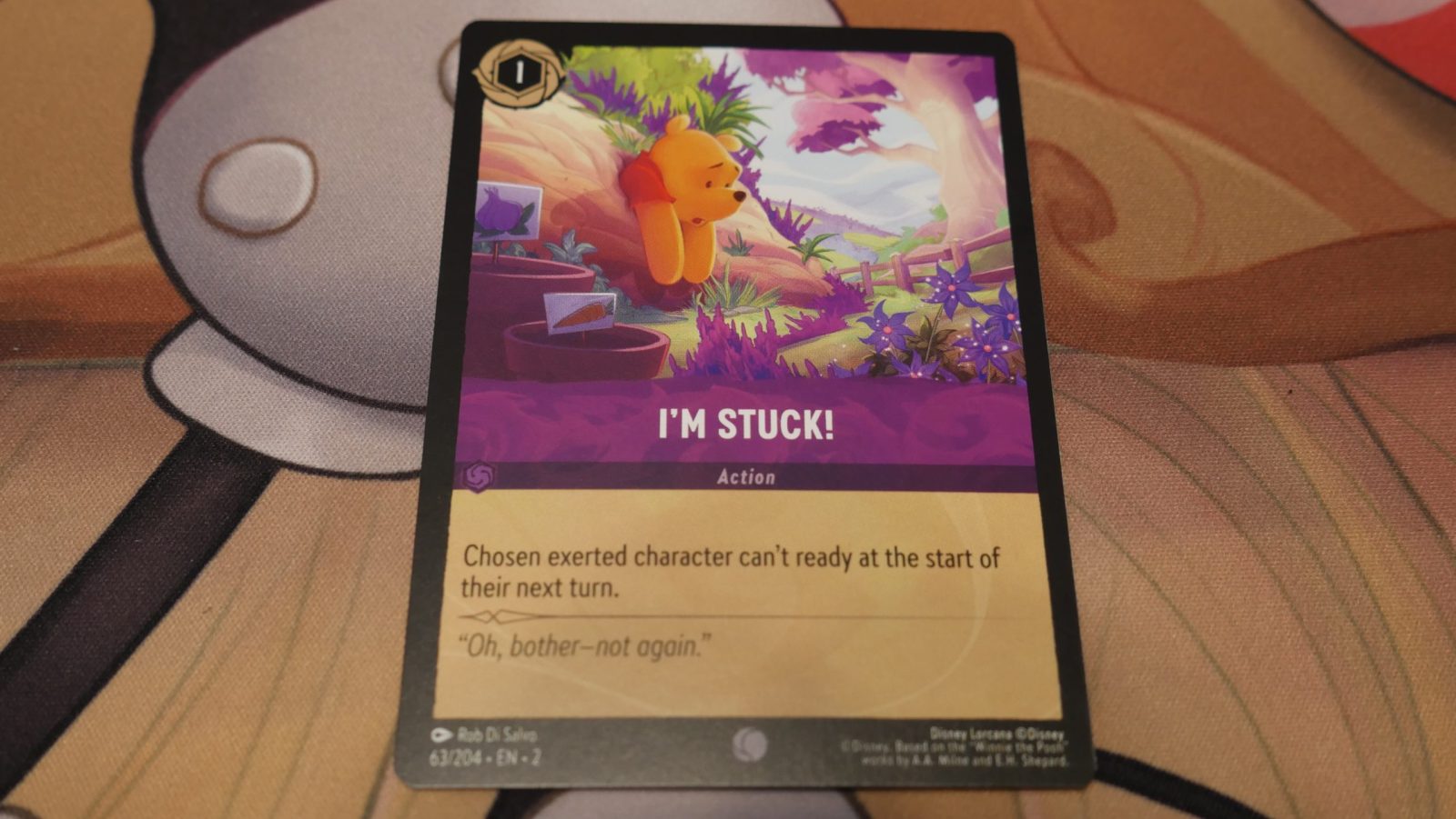 Hidden within the Amethyst-Steel deck are two of my new favorite cards. Dreamborn Heihei, Persistent Presence, has Heihei drawn as if he is some kind of chicken-phoenix hybrid, majestically spreading his wings as he returns to your hand again and again. While he works well in the deck with Merlin’s ability, I just love the idea of the death defying chicken reimagined as a phoenix. The artwork by Ellie Horie juxtaposes the silly chicken with spirit-like phoenix feathers in an extremely satisfying way. The second card is my favorite for two reasons. One is that I am a sucker for Winnie the Pooh, and Owl’s line, “I say, are you stuck?”, is a household favorite saying for my family. The other is that the ability is crazy good: “Chosen exerted character can’t ready at the start of their next turn”, it only costs one ink, and it’s inkable itself. Don’t sleep on Pooh Bear. This card is going to be a menace.