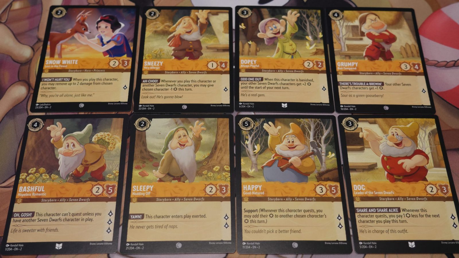 Despite the great new takes on the featured villains, the highlight of the deck for me is the inclusion of Snow White and all Seven Dwarfs. All are in their classic storyborn form and are dripping with thematic intent baked into their design. Snow White heals, while Sleepy comes into play already exhausted, and Bashful is too afraid to quest unless he has a buddy with him. The remaining Dwarfs are all similarly well designed to bring the characters to life on the table. While I’m sure we will see other Storyborn and Floodborn variants of these cards in the chapter, I really appreciate the inclusion of the classic characters to offset the new Floodborn designs. Ravensburger could have made getting a full set of Dwarfs a collectible challenge through boosters, so including all of them in the starter deck (at least 1 of each, not a “full” playset) is just really cool of them.