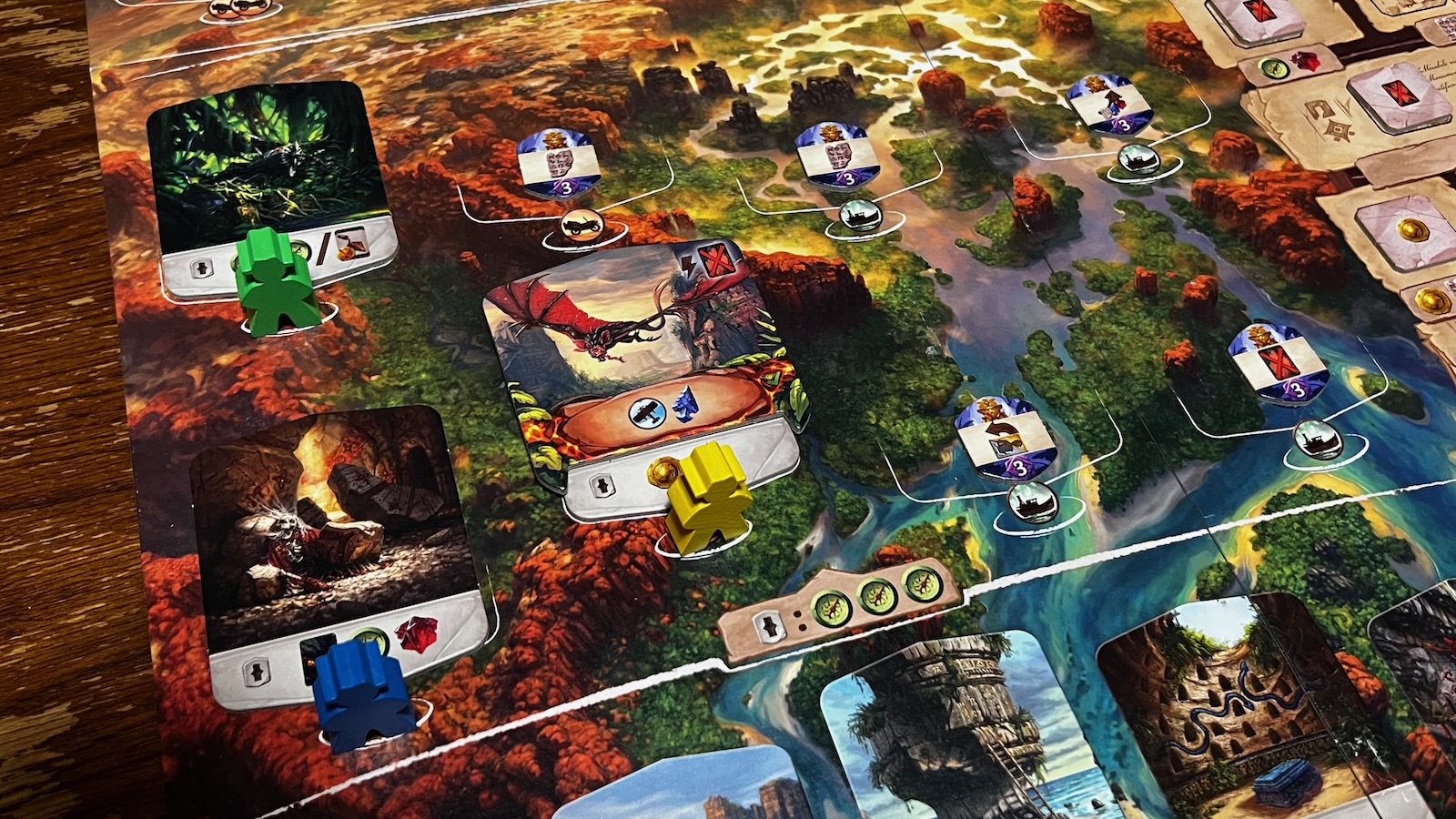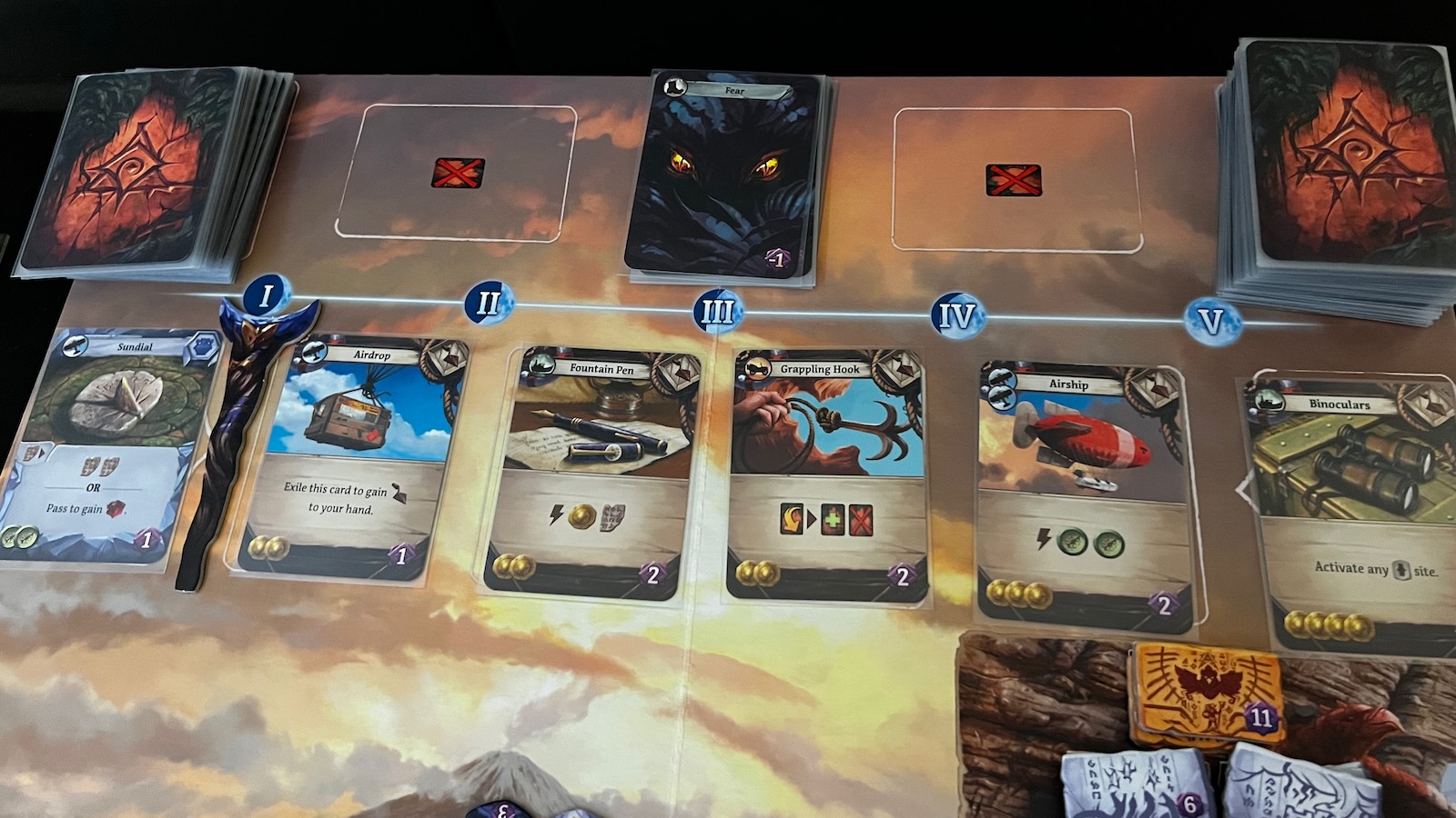 Each player starts with the same starter deck of cards that they can bolster through the purchase of items and relics. Every one of the cards in the market is unique in name, artwork, and ability. Cards are used to pay travel costs with the symbols in the corner or for the abilities listed on the bottom of the cards. Purchased with gold coins, item cards go to the bottom of your draw deck for use later in the game. Purchased with compasses, the relic cards immediately go into effect as you buy them and cost an additional tablet when they are used later in the game. Each card purchased from the market also adds between one and three victory points for the end of the game. Players must also deal with the overwhelming sense of fear their explorers are facing. Players start the game with two fear cards, but can gain more from various conditions on the board. Players are encouraged to get rid of fear throughout the game as each one takes away a point from a player’s final victory total.