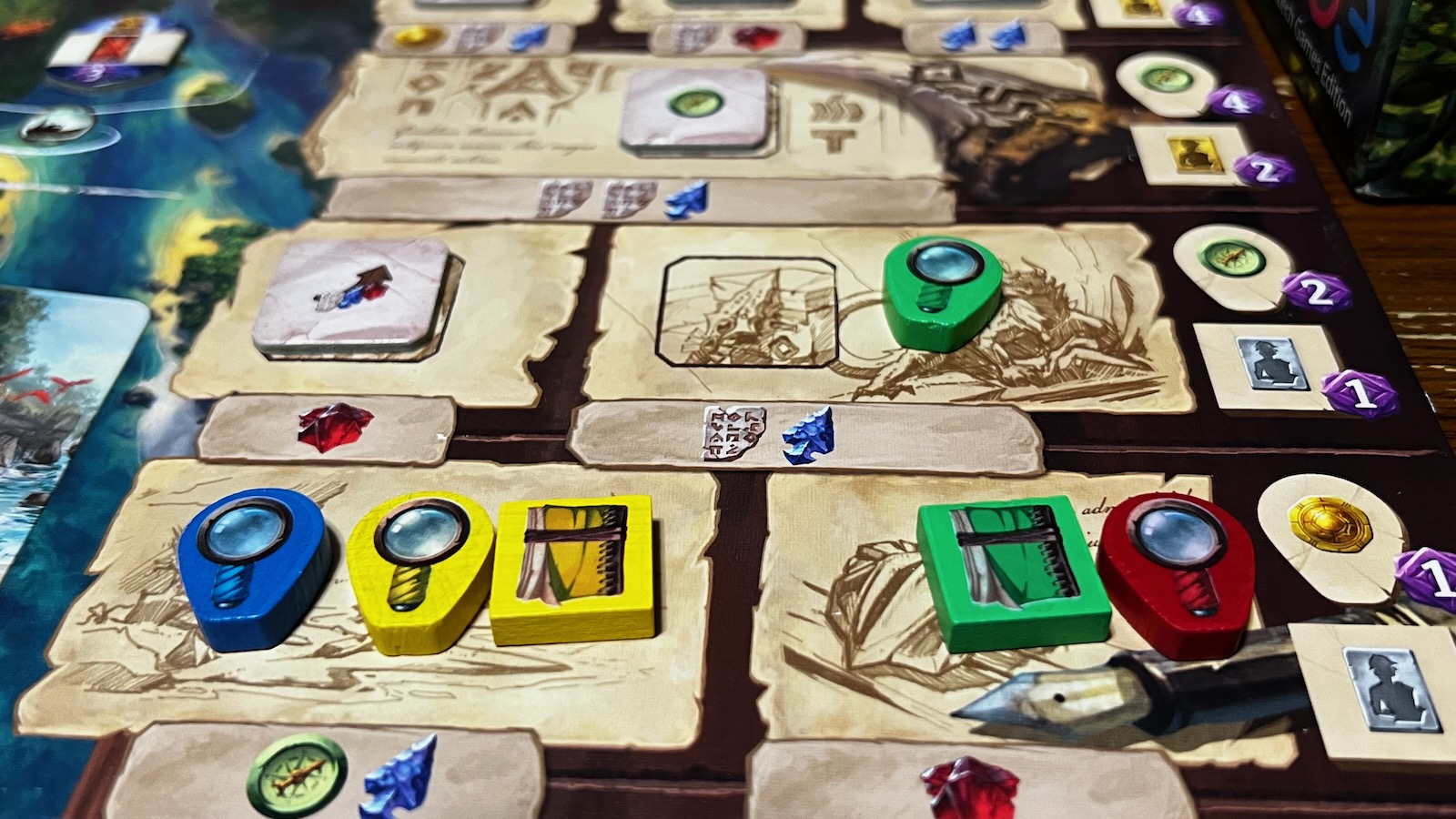 On a player’s turn, there are numerous actions that a player can choose from. By paying a cost, players can move up the research track with their magnifying glass or their journal. Each level of the track leads the players closer to the temple and gains the players different bonuses depending on what level and what tool they are using. One of the best bonuses are the assistants you can hire that give you one time bonuses each round. Another fun part of the research track is the fact that your journal cannot outpace your magnifying glass. You have to find it before you can write it down!