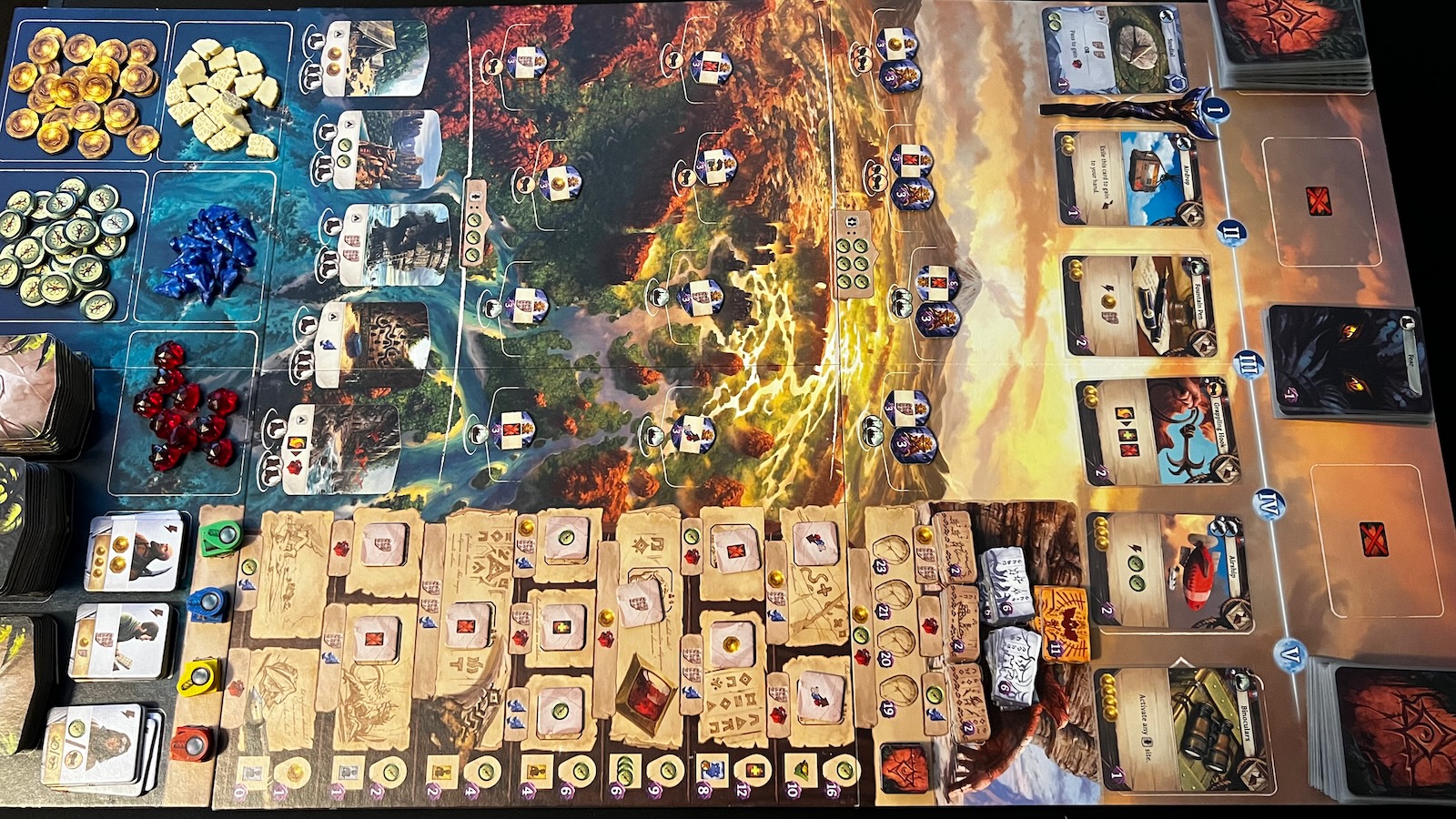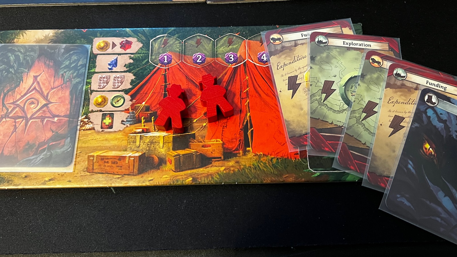 The gameplay weaves the theme through the worker placement, deckbuilding, and resource management mechanisms seamlessly. While the game favors the player who can combo actions and think ahead, it doesn’t feel so heavy that new players can’t pick it up quickly. Players have the opportunity to try different strategies to get to the high score. In one game, a player may focus on exploring, while another may focus on the research track, while another may focus on building the deck up with high level cards. On the downside, unless people are buying items and relics, you won’t see a wide variety of cards to build your deck from. The storage box is also an odd shape compared to most and the lack of insert means an unorganized mess when opening up for a game.