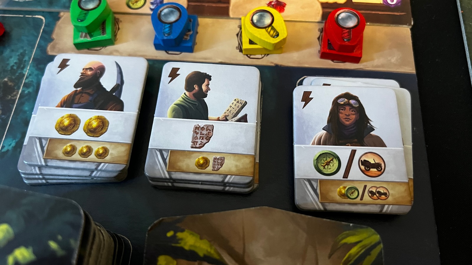 Another major action that a player can take is placing their explorers on the different sites around the board. The base camp spaces give players valuable resources needed to pay for other actions around the board. Other options to explore are the level one and two dig sites. Each of these sites has a compass cost to discover, but come with bonuses in the form of idols and resources. Each newly discovered site is also inhabited by an island guardian that you must overcome by the end of round. Each guardian has a cost a player must pay, but gives the player a one-time bonus and five points if they are defeated. If a guardian is not defeated by the end of the player round, then the player gains a fear card and opens up the guardian for another player to overcome.
