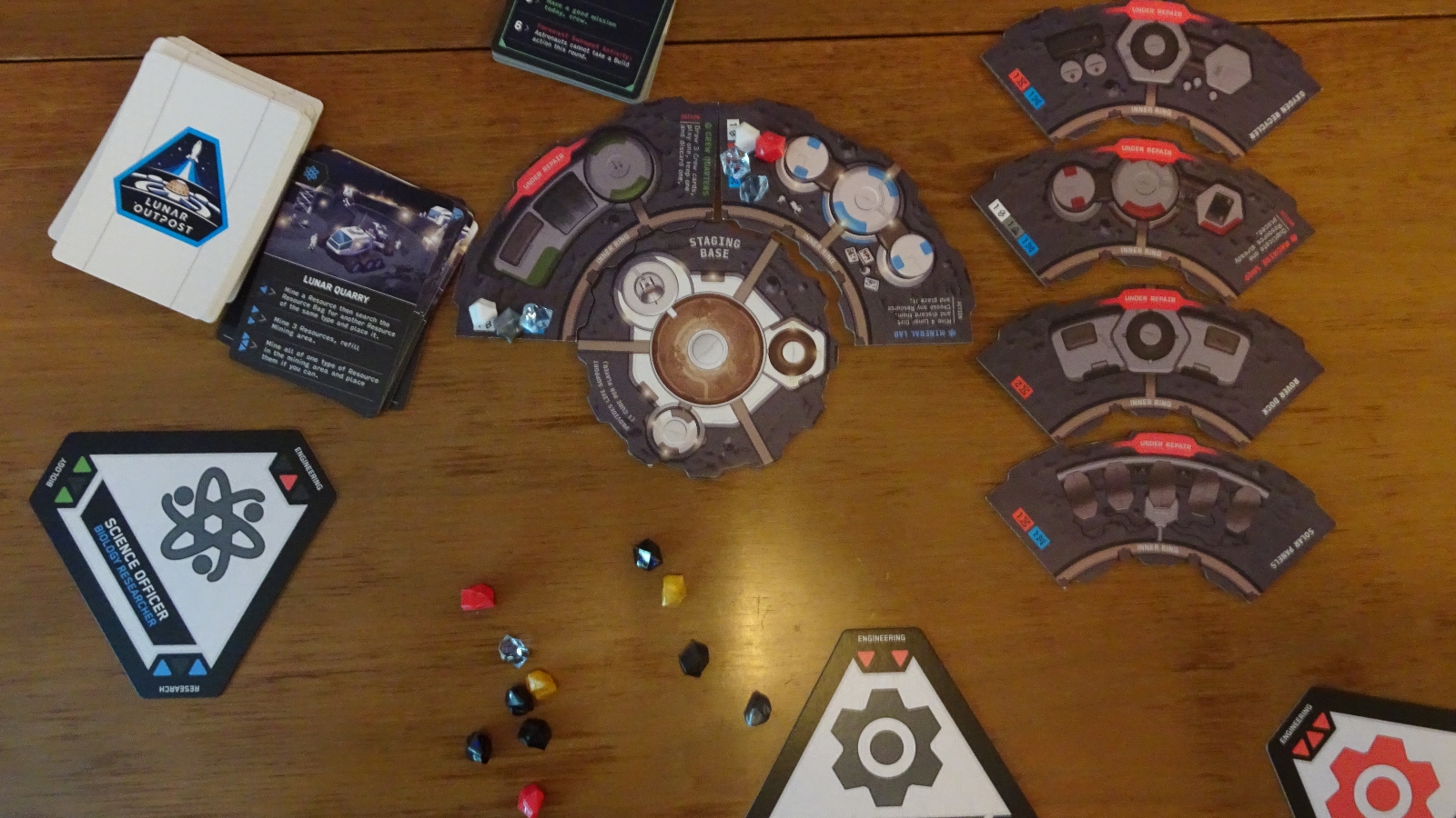 Other things conspire to make Lunar Outpost feel like it needed more time in testing. The game literally does nothing to scale for more players, other than simply being easier. Each round, every player gets a single turn barring anything else, so with 4 players there are simply more turns than with 2 or 3. This is very apparent when a base section gets damaged and takes out two players, with 4 players it’s not that big of a deal as compared to a full round lost with only two players.