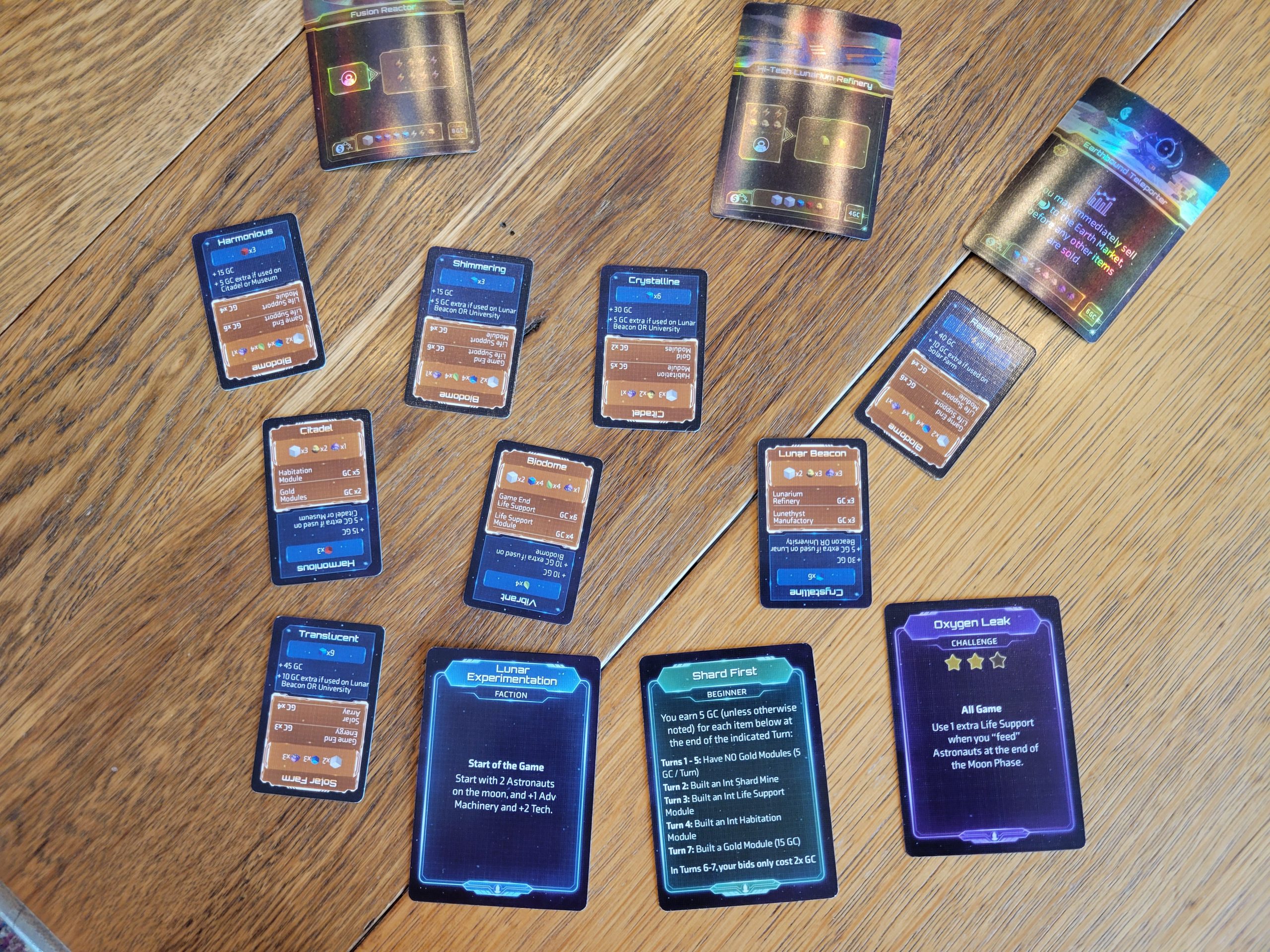 As you might have guessed, without any incentives to bid low the game quickly devolves into playing your highest bid on cooldown, but that’s where the gold modules step in. These are overpowered extensions to your moon base that you build from the public options in reverse bid order. There’s inevitably going to be a few turns where the available gold modules don’t work for everyone, so there’s the moon wonders mini-expansion, drafted by the players in a phase right after gold modules in that same reverse order. They also mix up the game with a nice dollop of points and rewards for different builds that aren’t optimally utilized without them, which is always nice.