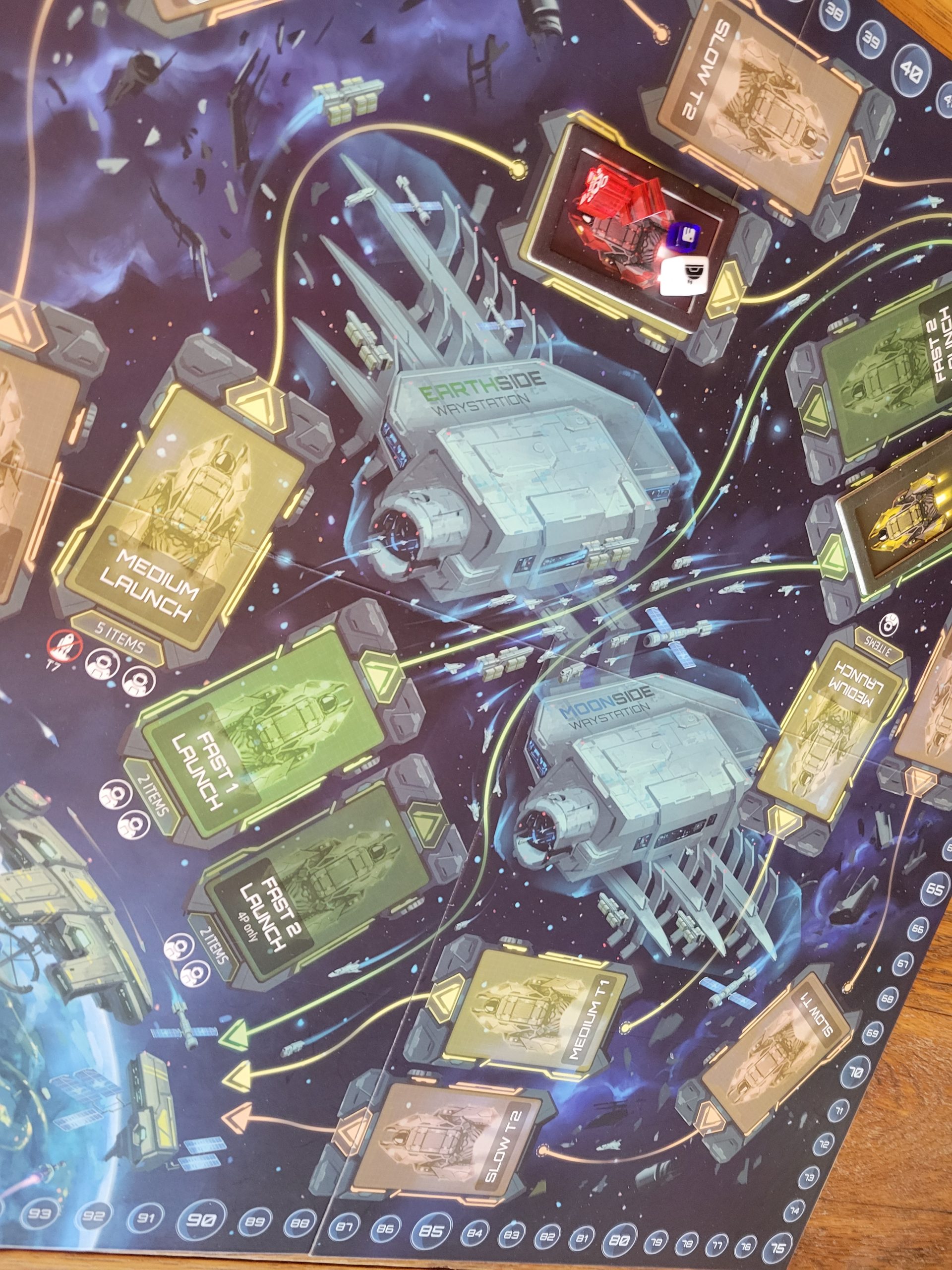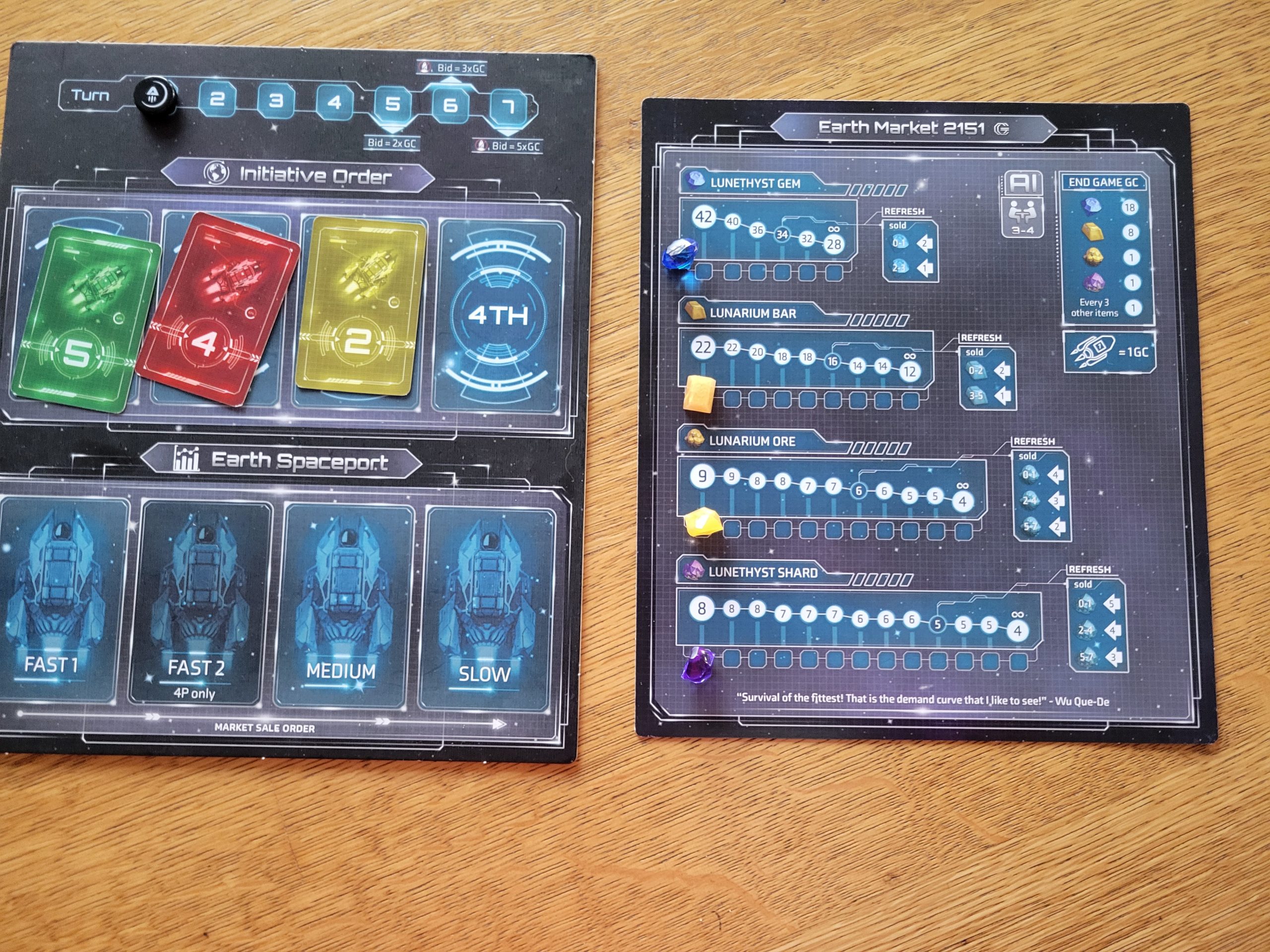 Lunar Rush dips its toes in a whole lot of pools, mechanically. Players cycle through their bid cards in a secret auction to get first dibs on shipping lanes to send stuff to and from the moon on cardboard tray ships that are a surprising delight to load and push around the board, and then use those resources to build a personal worker placement engine on their player board moon base. Finally, they can sell their moon goods back on earth on a simplified market where each item sold drops the price of that good until the price gets too low and it triggers a reset. The whole process is easily learned and mastered by genre adepts, and the beginner cards with round specific point rewards for specific goals that’ll get noobs on their feet do an amazing job of keeping everyone on an even playing field.
