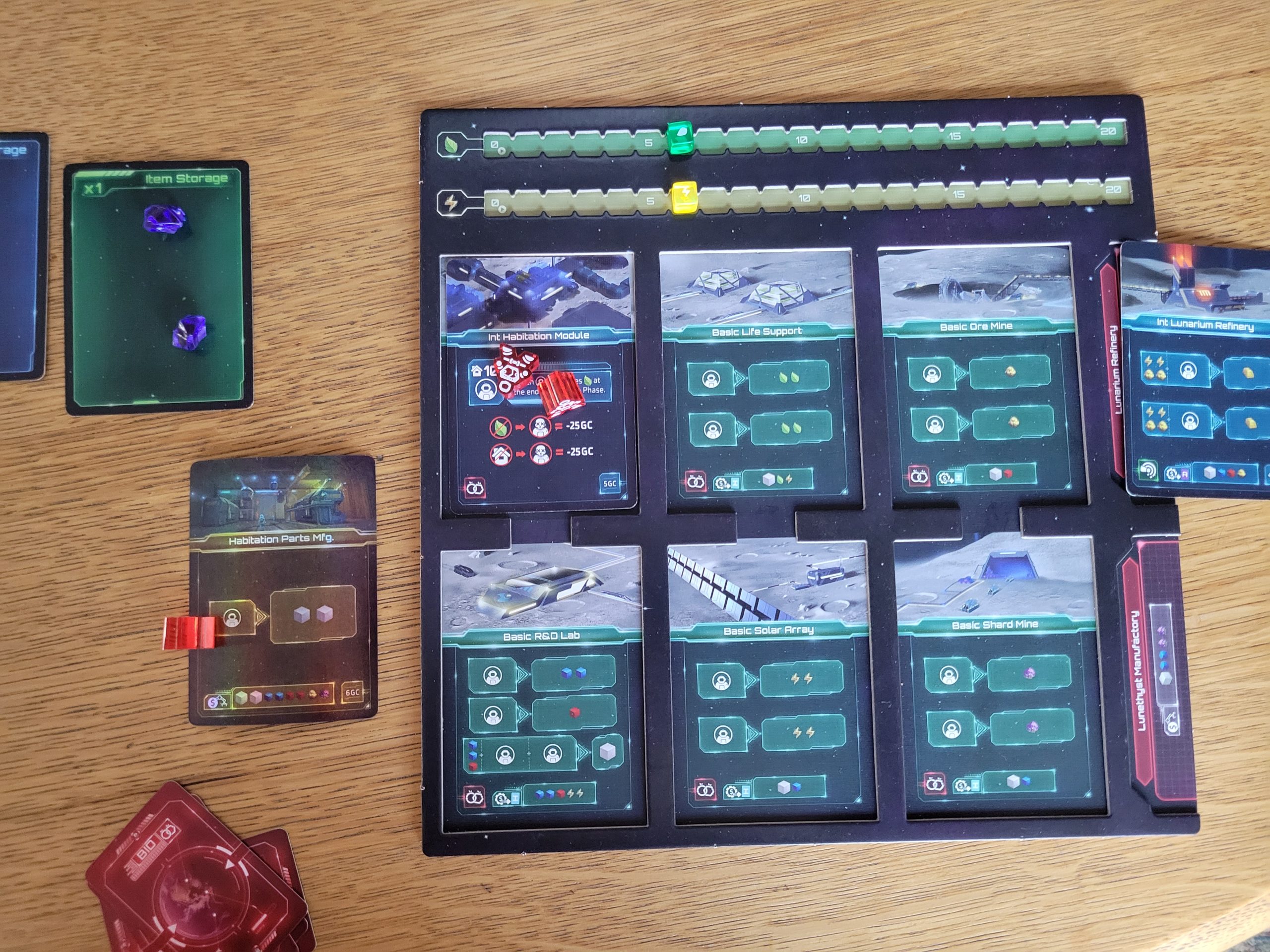 By now you’re probably looking back at that score confused as to why I gave a game I have so many nice things to say about a 75. Well, there’s just enough missteps here and there that you can tell that Dead Alive is still coming into its own as a publisher. Those linchpin gold module cards? A smidge too dark and foiled like an old Magic card, making them hard to read from across the table. They also have the hallmark mtg foil warp/bowing issue, making it so they don’t properly function as the worker placement spots most of them are supposed to be. The rulebook is formatted strangely, with a two-page break after the component bit in the front for some flavor and lore and an essay on the science of moon launches in the back where you want the index and whatnot else. You put that stuff in its own book or a separate sheet or something, otherwise you wind up with these issues that make themanuals harder to use than necessary. Speaking of unnecessary impediments to use, the hard sci-fi theme makes it so the building art on your base upgrade cards are generally samey and fail to convey their purpose with a couple exceptions. I know you’re not gonna hit the O’Toole ideal of beauty and function with all your art, but it feels like the choice of theme proves to be a hindrance more often than not when I’m looking at a sci-fi game.