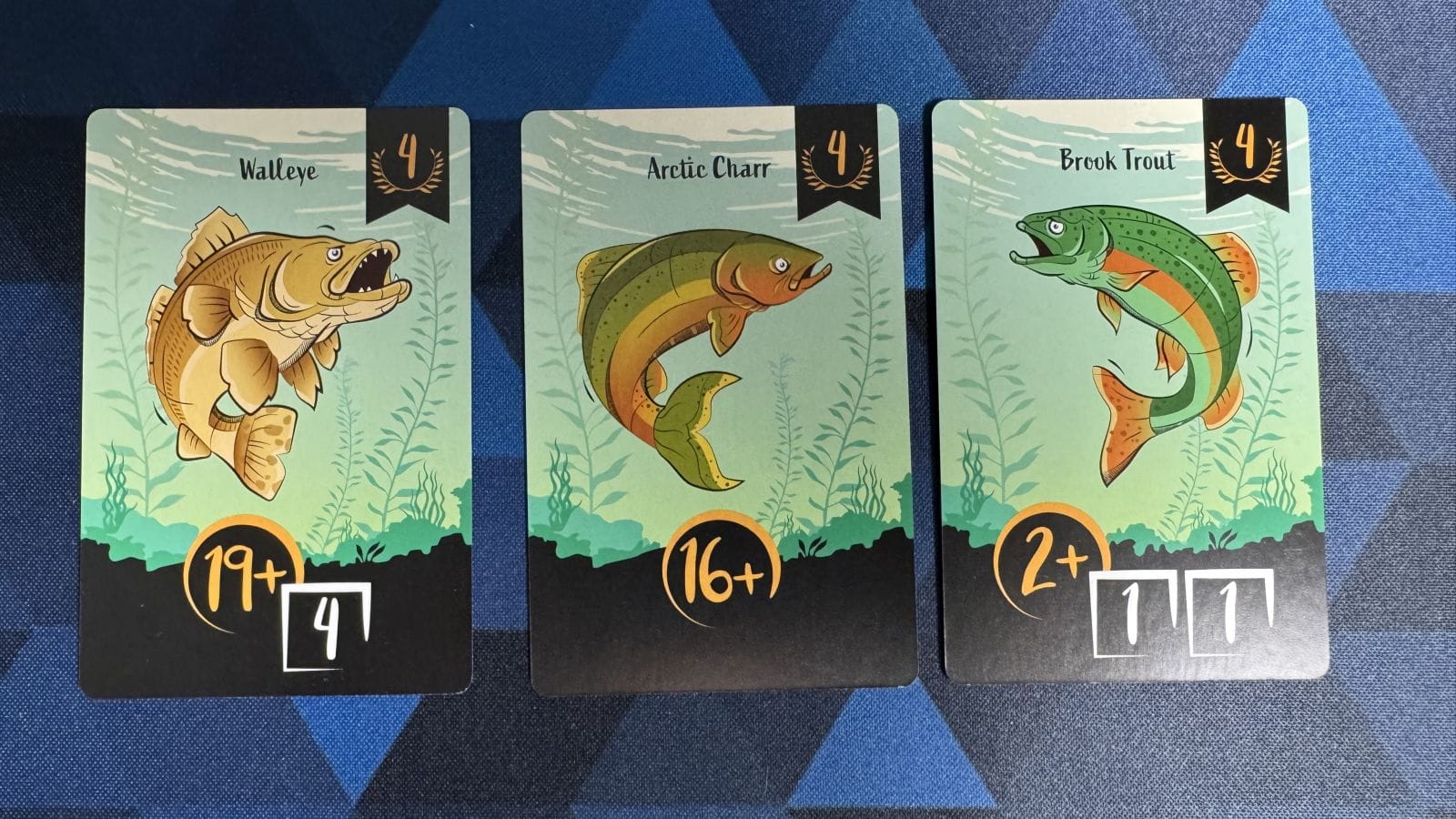The fish are all worth end-game points and feature different requirements if you want to catch them. There is always the total dice roll that needs to be hit, but you also have things like two dice that need to be the same number, or you have to have a 1 and a 5 in your roll. You can see where the statistical requirements to hit certain combinations will drive you to want to roll more dice. Then again, what if Jimmy gets lucky and takes the fish you were eyeing with fewer dice before you get a chance to roll? Quite the pickle. The game ends when the fish deck runs out, and the player with the most points wins.