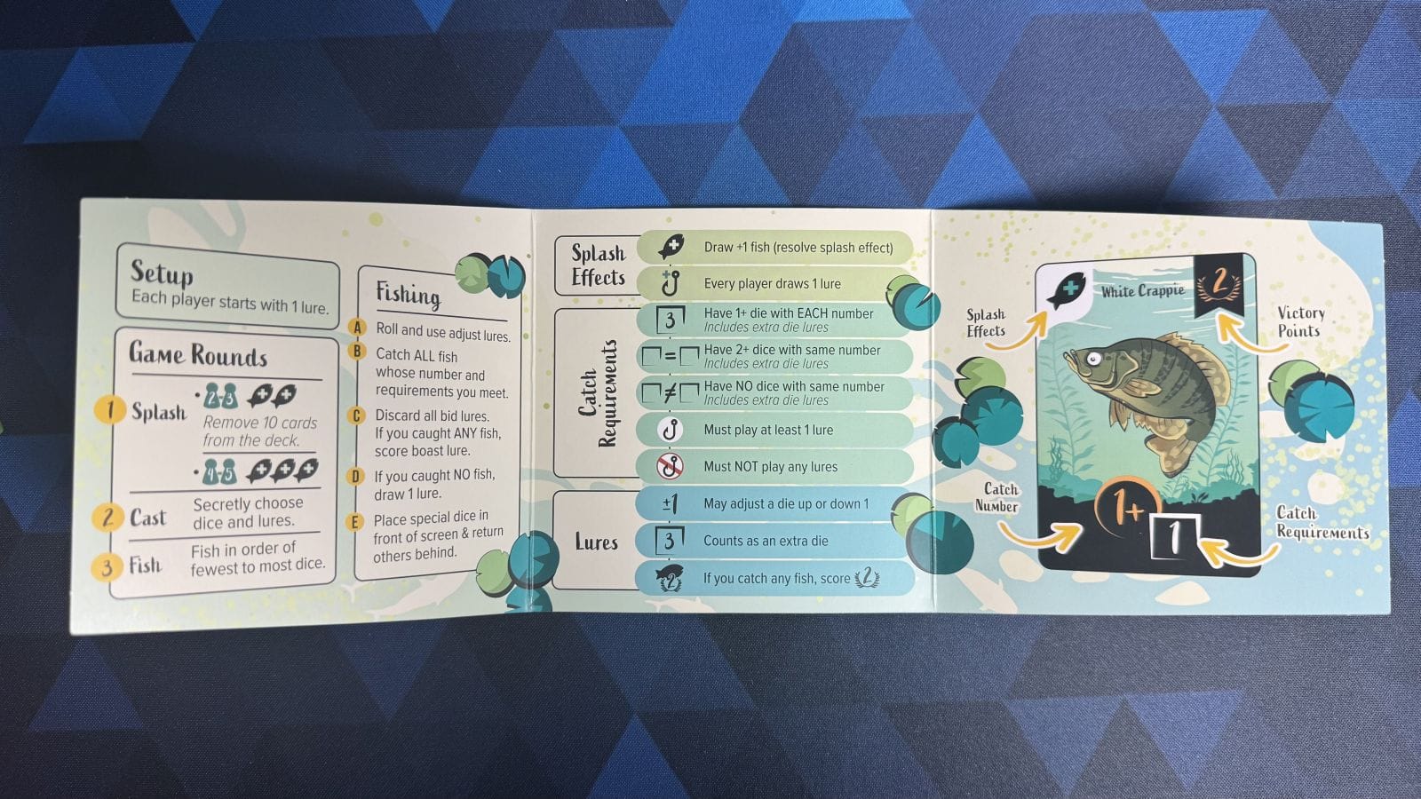 The production quality of this tiny game is fantastic. The artwork is lovely, and I have to tip my hat to Allplay for investing in unique artwork for all of the fish. The player screens have a great reference printed on the inside with absolutely everything you need to know to play the game. The dice have great color choices that are easy to read across the table, and the font is even reminiscent of fish hooks. Despite being a small filler game, Allplay did not cut any corners.