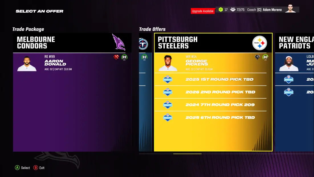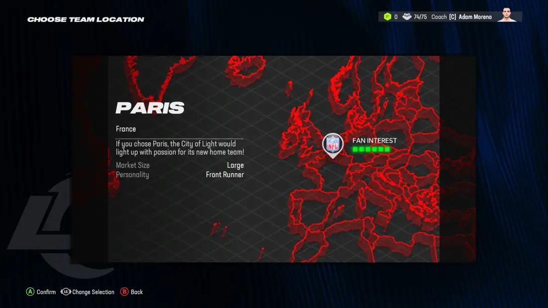 Let’s start with the good. A lot of the changes that fans wanted to see in Franchise Mode happened in Madden NFL 24. You can relocate as a Coach or an Owner which allows you to use one of many team designs for your team, relocating them to places like Paris, Melbourne, Tokyo, Memphis, and more. Trades have become more in depth as you can add up to six trade objects: up to three players and up to six draft picks, trading up to three years worth of picks compared to two last year. This makes those big splash trades more accessible if you’re trying for a player like Patrick Mahomes, Aaron Donald, Tyreek Hill, etc. On the player side, you’re able to restructure contracts to follow along the lines of Aaron Rodgers with the Jets this year. The scouting and drafting process has become easier with a feature to move to the next player without backing out and scrolling down again. These are all positive changes for Franchise Mode that makes the experience more realistic and enjoyable for players.