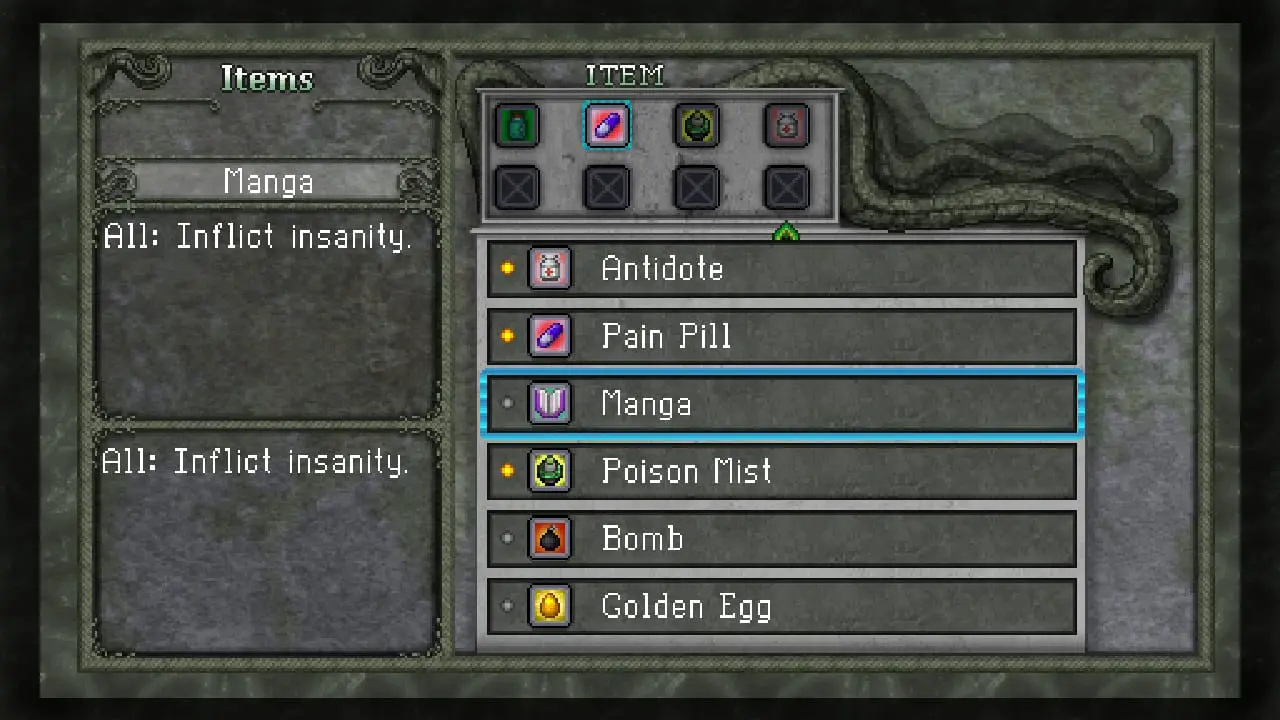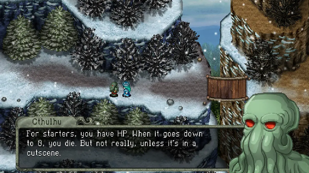 It isn’t a Lovecraftian horror work without Cthulhu handing out the ability to drive people insane, and some of his moves can inflict Insanity on enemies. Every time this is cast, the enemy changes its form and becomes a little more powerful, but also gets their weaknesses switched around. This means you can fight earth monsters that suddenly have a weakness to earth attacks due to Insanity (somebody get Sudowoodo in here, stat!), or an enemy that can finally succumb to your disarm attack. These new mechanics give Cthulhu Saves Christmas a distinct Lovecraftian-lite identity while still remaining a comedic RPG. It’s an engrossing system that I definitely want to see used in future games.