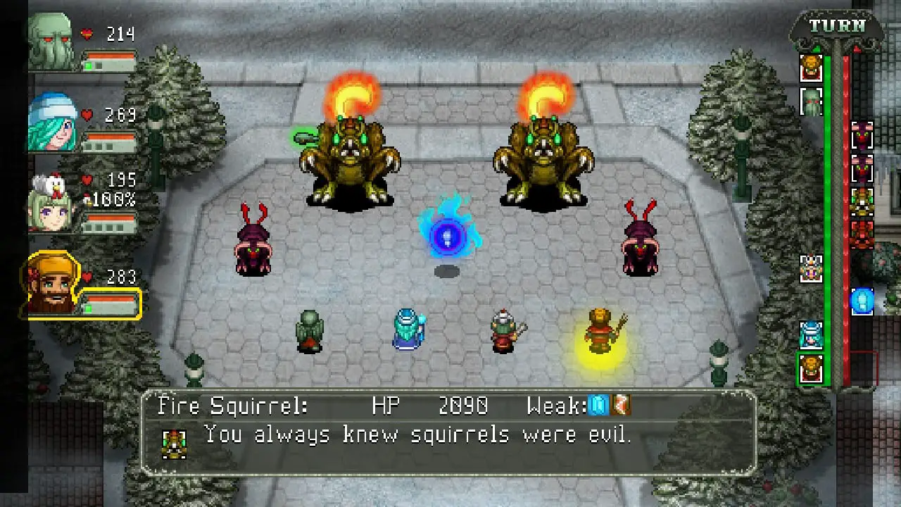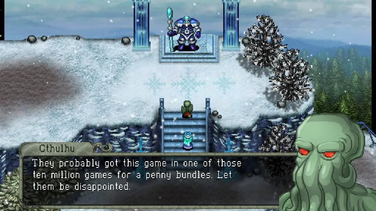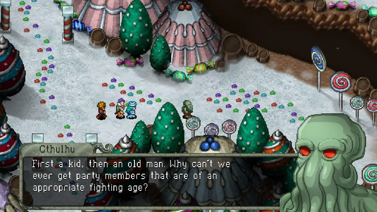 While this sounds like a run-of-the-mill RPG plot, the execution here is anything but normal. Due to the similarities of Cosmic Star Heroine, I’m going to compare both titles; I noted the story was a bit generic in the former, but here? Oh boy is it a ride and a half. The written dialogue feels like something from the English dub of the Ghost Stories anime, and it improves the enjoyment of the plot so much. Cthulhu laments about his powerlessness while Belsnickel proudly declares that he whips children, much to the Elder god’s delight. (Considering the original mythos, that’s… putting this lightly.) The League of Christmas Evil is stereotypically hammy, and the game pulls off more fourth wall breaks than Deadpool at a Marvel comic con. These monstrous creatures are dumbed down to bit players in a silly story which kept me entertained and loving the whole experience. When you can give me joke references of everything from Baba is You to Frozen, you bet I’ll laugh my butt off. I’m glad that the one thing Zeboyd could fix from the previous title was made better here.