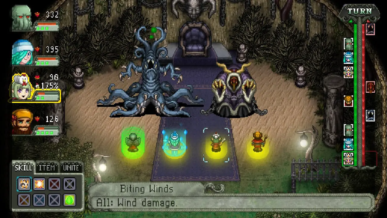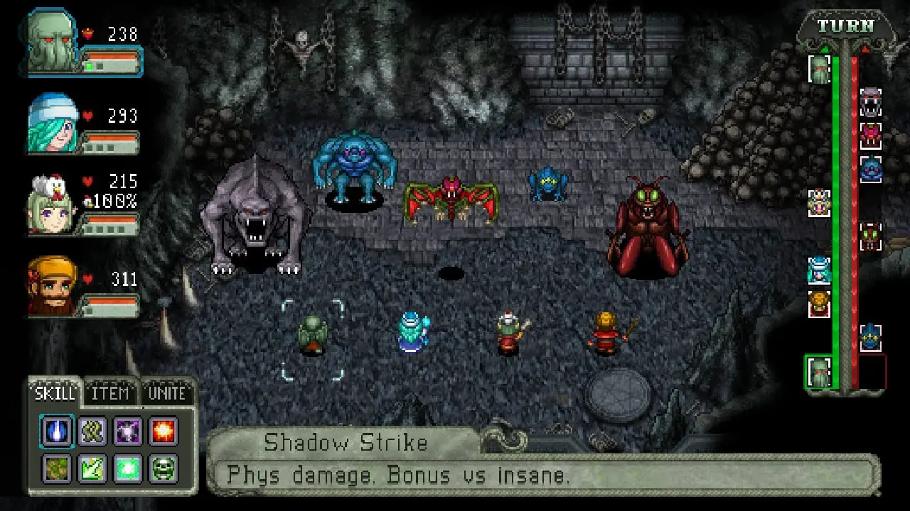 The main difference that separates Cthulhu Saves Christmas into a much more complex game is the inclusion of the Insanity mechanic. While Cosmic Star Heroine allowed you to pick seven abilities and your recharge freely, this game only allows you to pick four. The other three are randomly selected based on a pool of exclusive Insane abilities as well as abilities you didn’t choose. The bottom row of abilities will shuffle when you recharge, which adds a layer of complexity here. Suddenly, abilities that you didn’t even consider (say, a poison ability, which really is only good once) becomes viable due to the random draw mechanic. For example, Crystal has an unstoppable buff ability, which I wouldn’t select as a regular ability but would definitely use once or twice. Thanks to the Insanity mechanic, I could just wait for the move to show up in my bottom row of the move list and shuffle it out once I recharged again. You’ll also get Unite moves that can be used once per battle, though every pair of characters gets their own move together. Teaming up with Cthulhu, for example, will grant you powerful attacks while someone like Belsnickel will give you healing boosts.