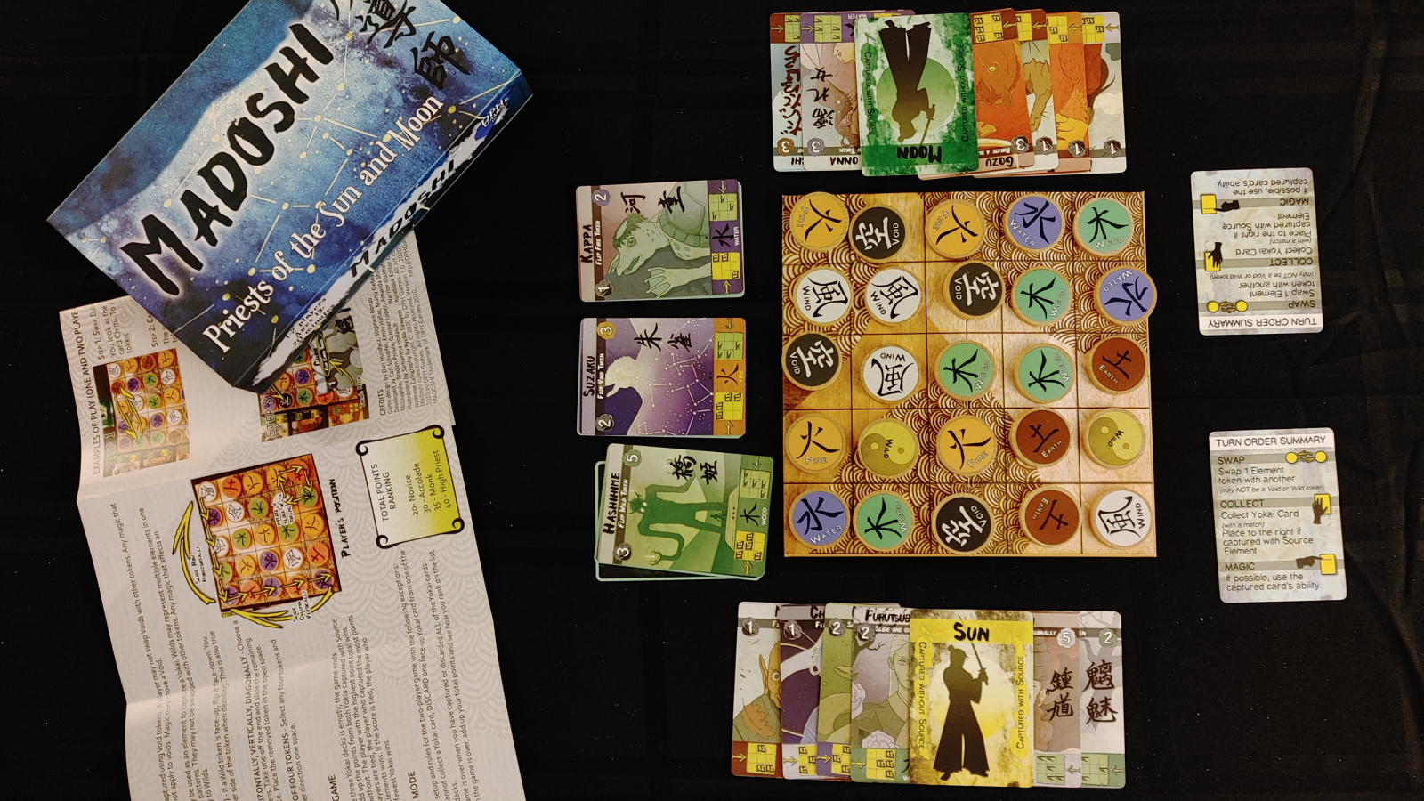 To start, there are 5 elements, earth, air, wood, water and fire, arranged in a 5 by 5 grid at random. There are 3 active Yokai at a time, which require matching 3, 4, or 5 elements strictly, so no rotation is allowed to make the match work. Each player will take turns swapping a single pair of element tokens, and if they match the element grid of one or more yokai, they take the yokai and its points and trigger its special effect. These effects range from flipping an elemental token, causing them to be either void, which is unuseable, or wild, which is usable as any element.