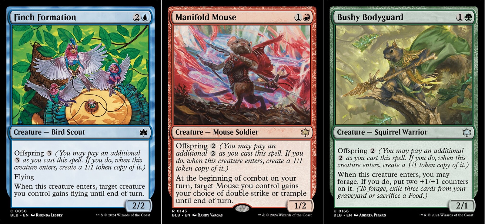 There’s a lot going on within Bloomburrow, but let’s start off with Offspring. Offspring is an additional cost when casting a spell that allows you to create a creature token that’s a copy of that card, except it’s always a 1/1. Yes, Bloomburrow lets you put literal children onto the battlefield. This might be the greatest set ever made. Mechanically Offspring adds additional flexibility to your mana. In the early game you might play a creature without Offspring just to get a body on the board, but later on you’ll have somewhere for you extra mana to go. A lot of the creatures with Offspring also help players break any board stalls that may be happening as they have abilities that push your creatures through so they can deal damage. I like Offspring mechanically, but especially thematically. :)