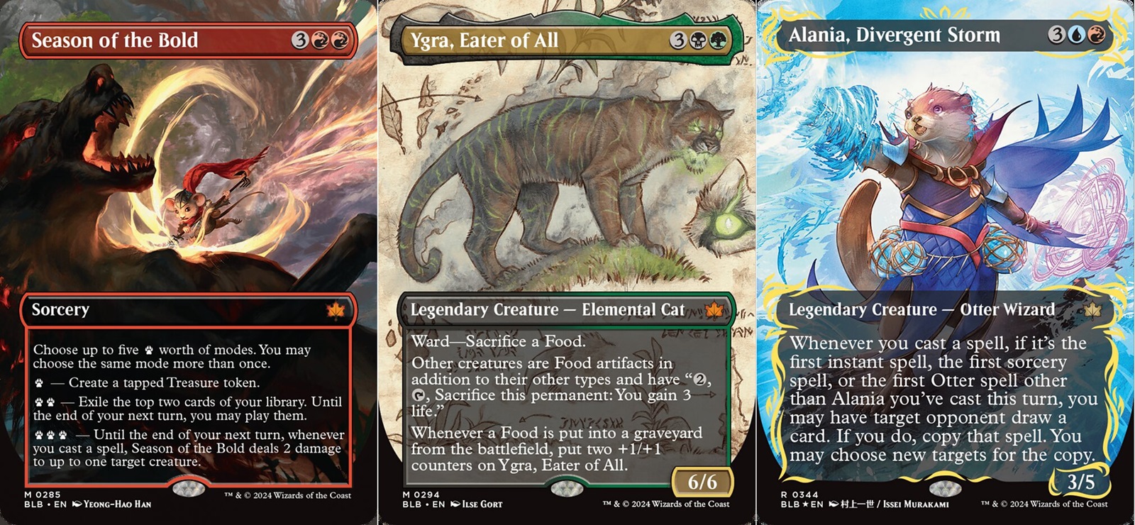 While the artwork within Magic is always good, Bloomburrow feels like a world that is wholly realized through its artwork. The set just came out and I already want another set on Bloomburrow just to see more of its world. All of the basic artwork is fantastic, but then the additional treatments are even better. I’m hit and miss with the varying art styles across Magic, but here I adore all of the artistic choices. The full art seasonal lands communicates the perspective of the denizens of Bloomburrow as the seasons change. The alternate artwork on cards like the Calamity Beasts teach us that the heroes of Bloomburrow don’t fully understand them. The watercolor inspired showcase frames are just perfect for the tone that Bloomburrow has. I’m not super big on the anime style cards, but here I also think they fit the setting. The artwork for Bloomburrow is just, chef’s kiss. Unlike other sets nothing here seems out of place or is working against its theme.