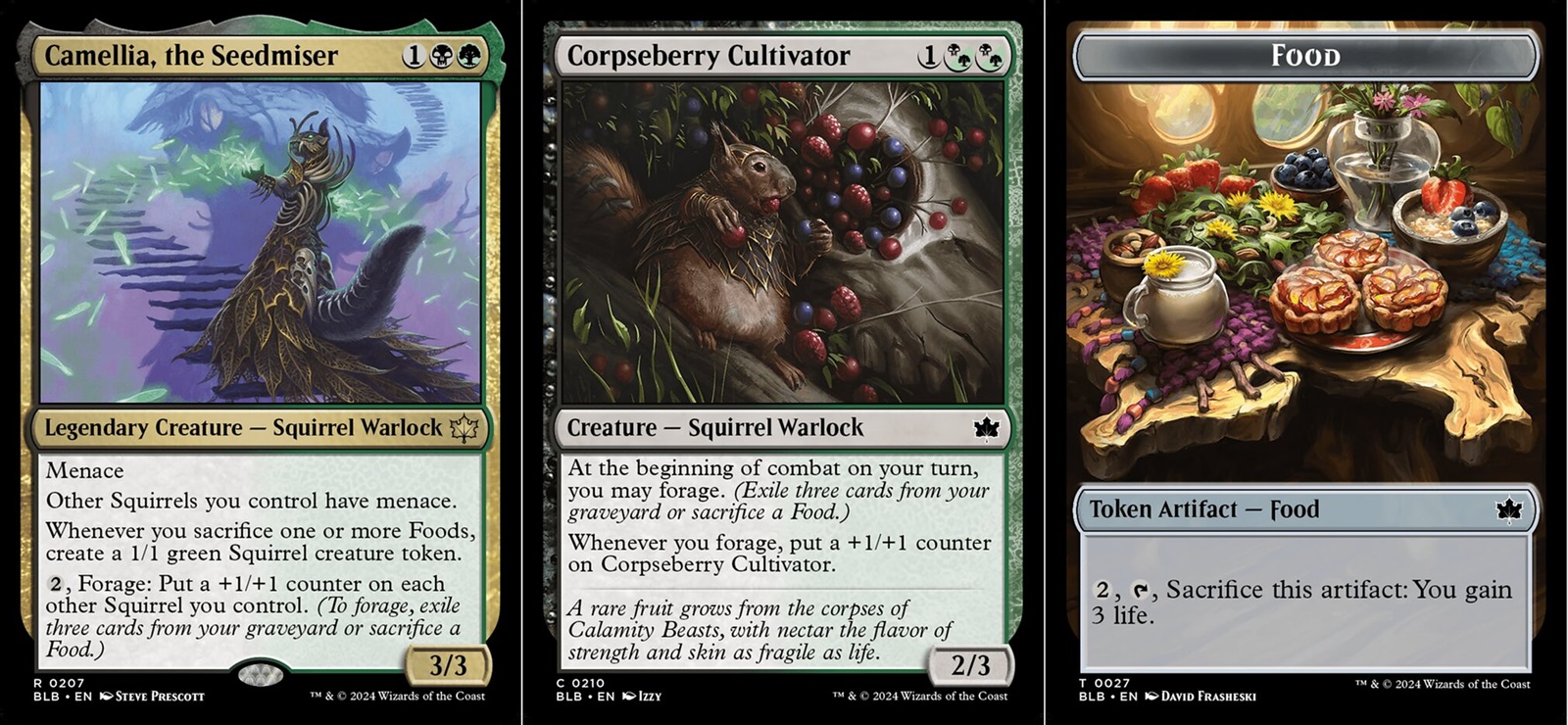 Forage is a mechanic tied to the black and green squirrels of Bloomburrow. The squirrels are all about “recycling” and whenever a card allows you to forage, you may do so by exiling three cards from your graveyard or by sacrificing a Food token. Forage lends itself to games that go longer as you need cards in your graveyard (or Food) for Forage to be useful. By design Forage is usually attached to creatures that will help you outlast your opponent and Food tokens themself can also help you regain some life against aggressive decks.