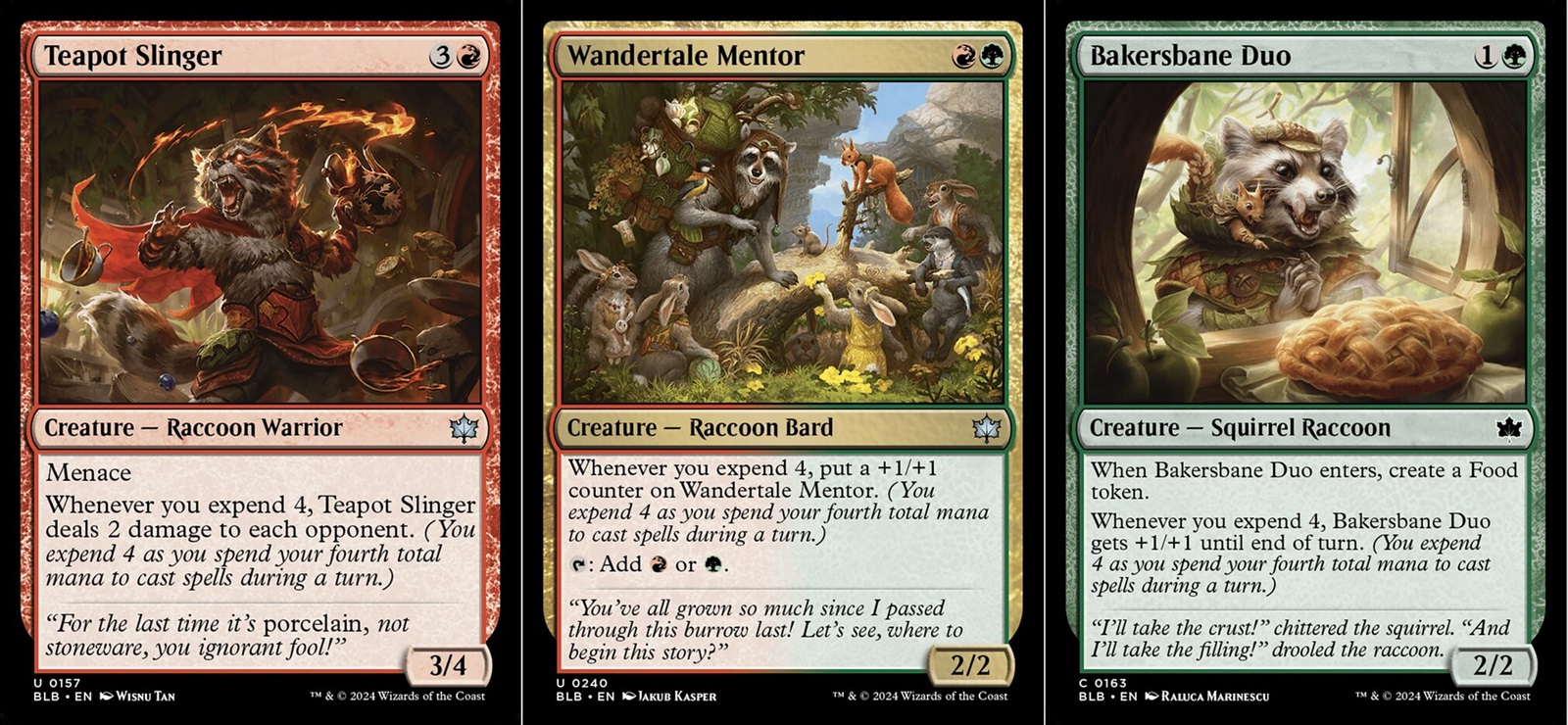 I would also like to highlight the design aspects of Bloomburrow that help players draft fun and functional decks. All of these design elements help players, but here they especially help newer players make better choices when drafting. In order to communicate the two color pairings Bloomburrow has the normal two color cards. There’s also cards with hybrid mana that immediately tell a player what deck that card wants to be in, but offers the flexibility to be played solely as one color. There’s a cycle of monocolor “Duo” creatures that serve a similar function as they contain two creature types that are in that color. There’s a cycle of five village cards that list each relevant creature type for that color. There’s just a lot of built in design that helps players draft cards that will work well together. If this is all gibberish, which is fair, if you open a cool raccoon in your first pack, just keep picking more raccoons. Bloomburrow is designed so well that you should end up with a fun deck even if you have no idea what you’re doing. You’ll see that raccoons are both red and green communicating that you can pick cards from both of those colors. Once you know what colors you’re in, you’ll then be able to better evaluate the cards coming to you in those colors.