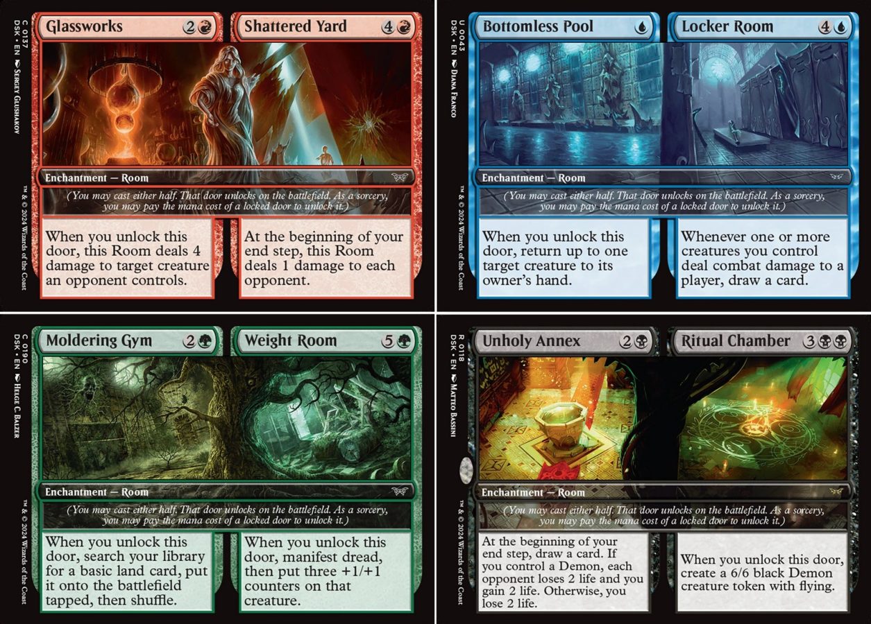 Let’s start with the mechanics and see how well they translate the horror theme. First and foremost are Rooms. Rooms are a split card that is an enchantment. You can cast the card for either side of the Room and can later “unlock” the other side for that Room’s mana cost.