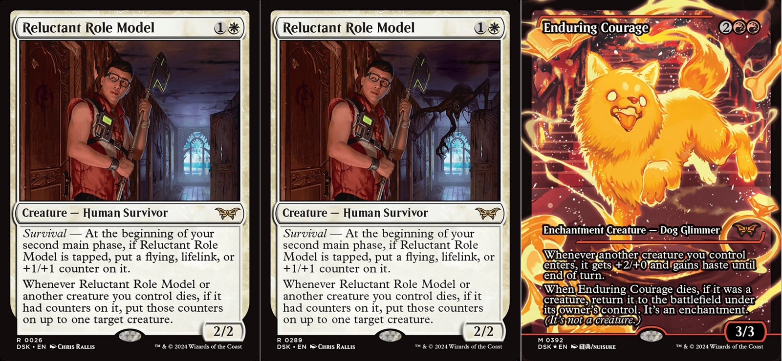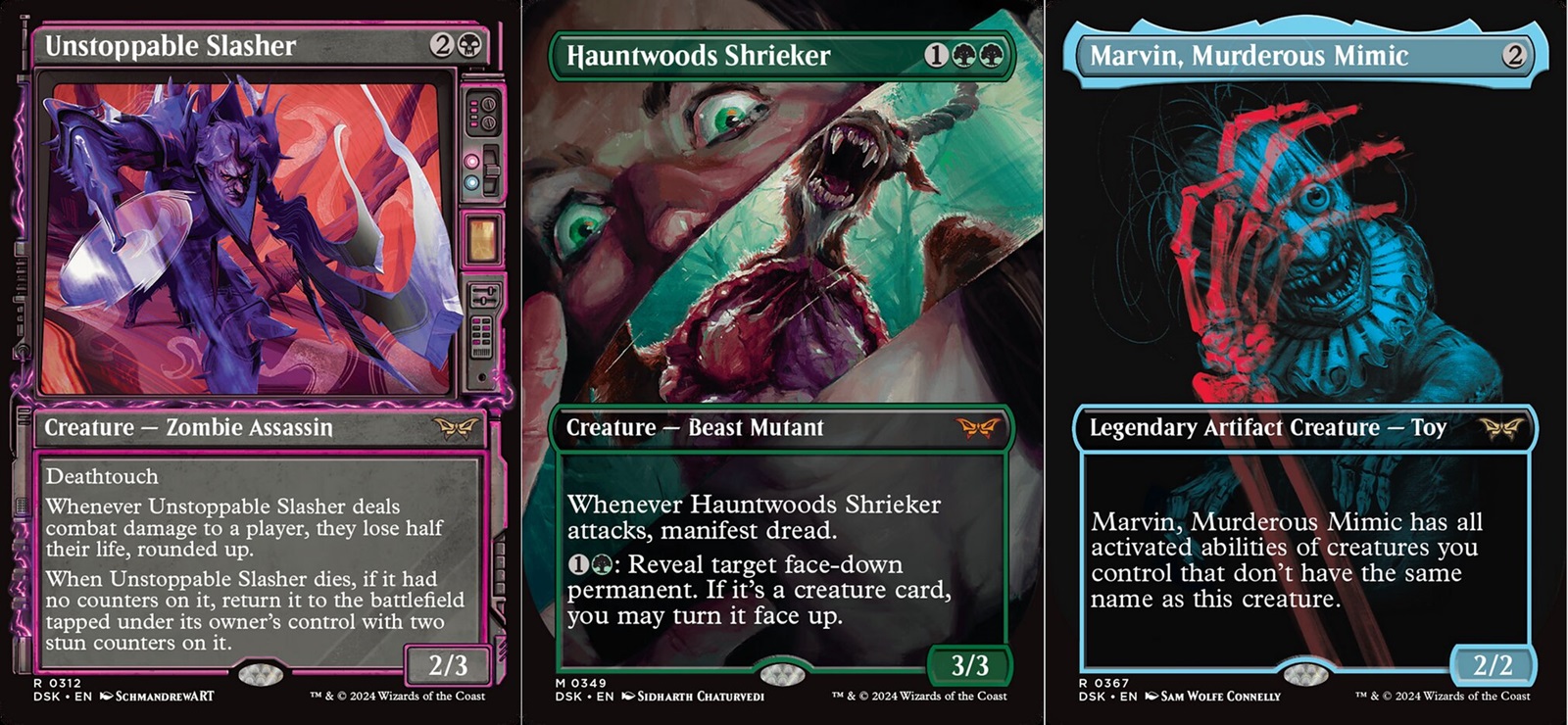 A Duskmourn showcase frame, a borderless frame, and a double exposure frame