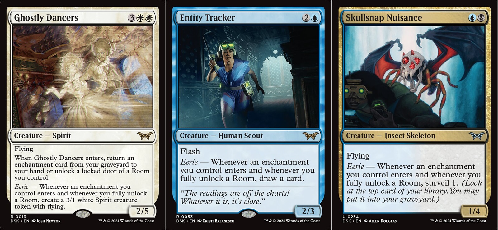 Next is a new ability keyword, Eerie. Eerie triggers when an enchantment enters, or when a Room is unlocked. This goes hand in hand with the Rooms. You’ll notice that Eerie follows the iterative design that we’ve seen a lot lately as Eerie is an update to the Constellation mechanic from Theros. This will come up later as we examine the pros and cons of Duskmourn’s set design.