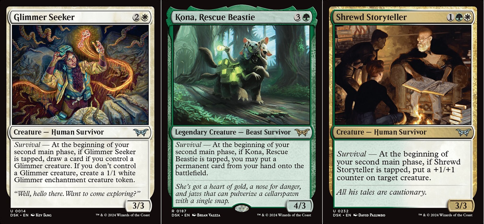 Survival is another new ability keyword. Survival will trigger if that creature is tapped at the beginning of the second main phase. Thematically, this is supposed to represent the creature surviving combat, but the mechanic does not care how the creature was tapped. As we will see there are ways in Duskmourn to enable Survival that don’t involve the combat step.