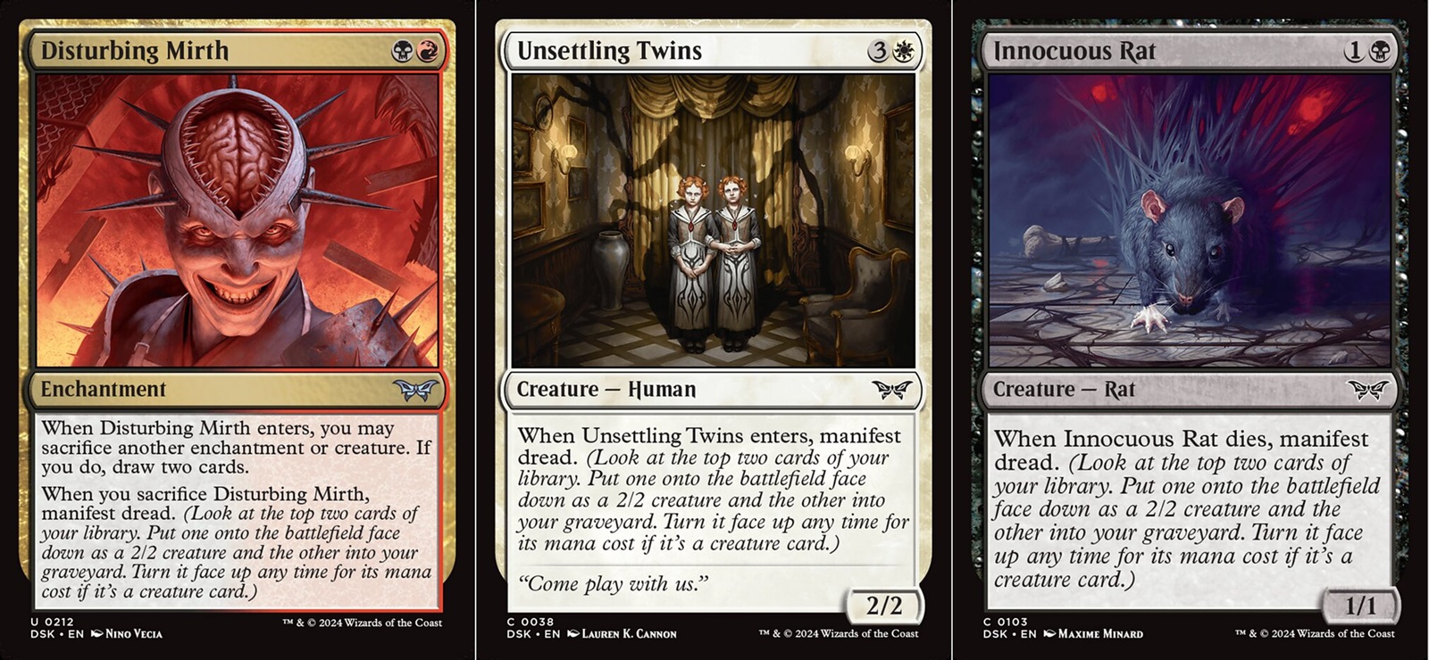 Manifest Dread is a new variant of… Manifest. Manifest Dread is a strict upgrade as this allows you to look at the top two cards of your deck, choose one to Manifest, and the other to go into your graveyard. Manifest has you place the selected card facedown as a 2/2 which can be turned faceup later for its mana cost if it’s a creature.