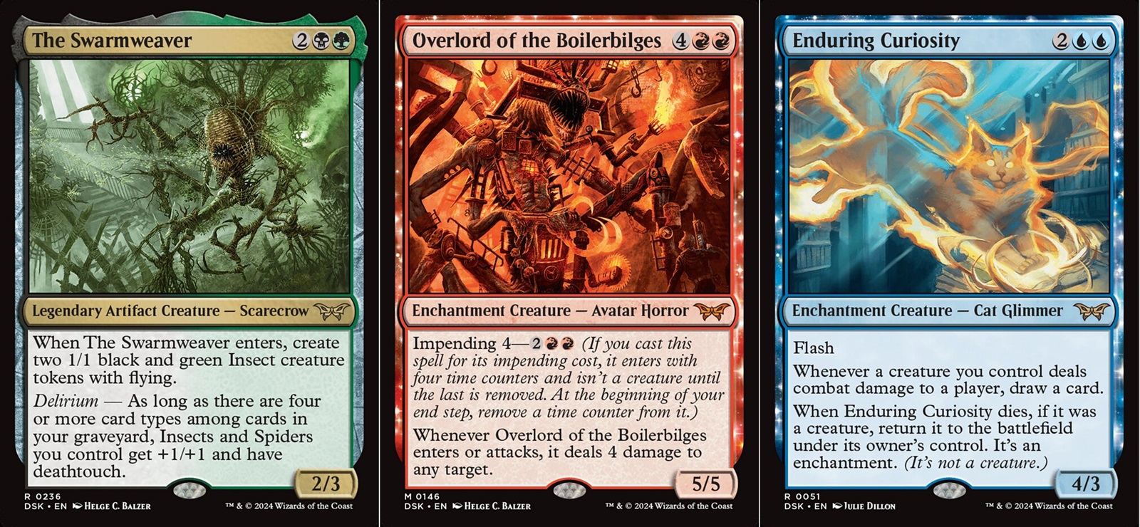Delirium makes a return as a way for Duskmourn to use the graveyard. Delirium enhances cards when you have four or more card types in your graveyard. Lastly, there are a couple of five-card cycles that are new and pop up enough to warrant mentioning. The “Overlords” are five enchantment creatures that have a new keyword – Impending. A creature cast for its Impending cost enters as an enchantment and slowly ticks down its Impending counters until it becomes a creature. The opposite of Impending, there are the Enduring cards. These five creatures start as creatures, but if killed, they return as an enchantment.