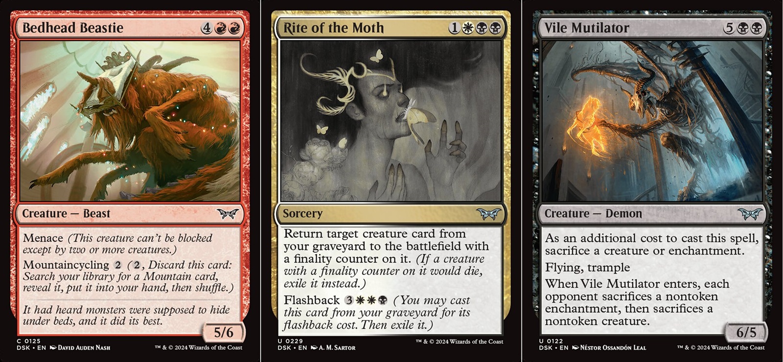 Duskmourn doesn’t do anything particularly new, but its bones do a good job of supporting its theme and setting. A lot of cards in Duskmourn are enchantments and this subtheme helps communicate the unsettling plane. You get the sense that there’s a persistent nature to the magic within Duskmourn. Since Rooms are enchantments, they’re common across all the draft archetypes. Playing out a lot of Rooms does feel like exploring a creepy old house that doesn’t make any sense. Rooms are an interesting design, as they accrue small incremental value the more you play them. If you’re facing a Room deck, you might get squashed by the house your opponent is building.