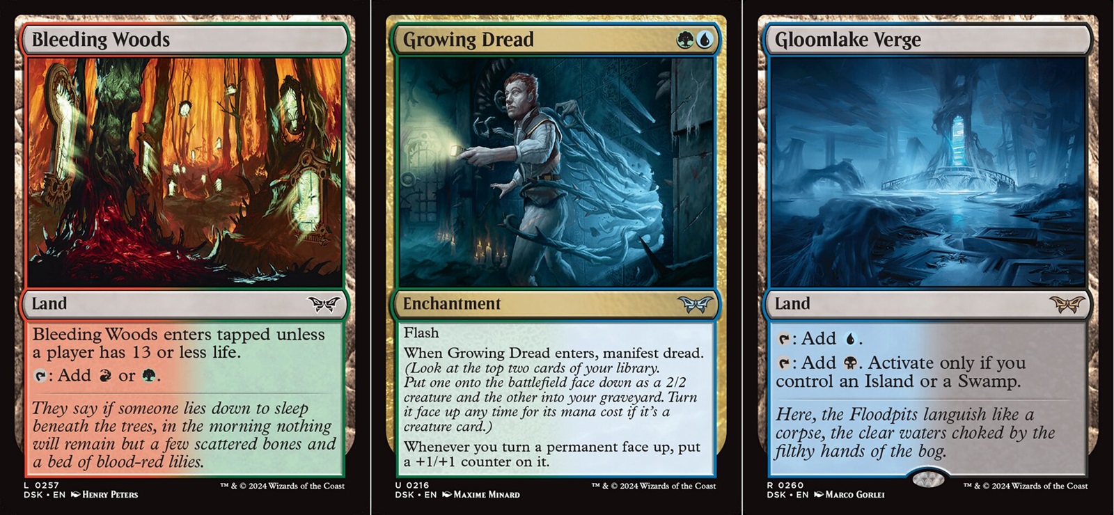 I’m almost mad at how good Manifest Dread is mechanically and thematically. Mechanically, it offers card information, a creature into play, and a card into your graveyard. Why is all of that good? Do I want to put a card in my graveyard? Manifest Dread offers you a much more informed choice about what cards you’re drawing or not drawing. Putting a card into your graveyard helps power Delirium and can help you trash cards useless cards. Manifest Dread only to see two lands? Well, at least you’re not drawing those two lands now. Manifest Dread also isn’t so pervasive that I find it annoying. Murders at Karlov Manor had a similar mechanic called Disguise. It was a key part of that set and I just found all the hidden creatures exhausting. Here in Duskmourn, it’s thematic to be frightened of facedown cards and it feels more special as they are less frequent. Reanimation (bringing back cards from your graveyard) is also more common in Duskmourn and here Manifest Dread can also set you up to reanimate a powerful creature.