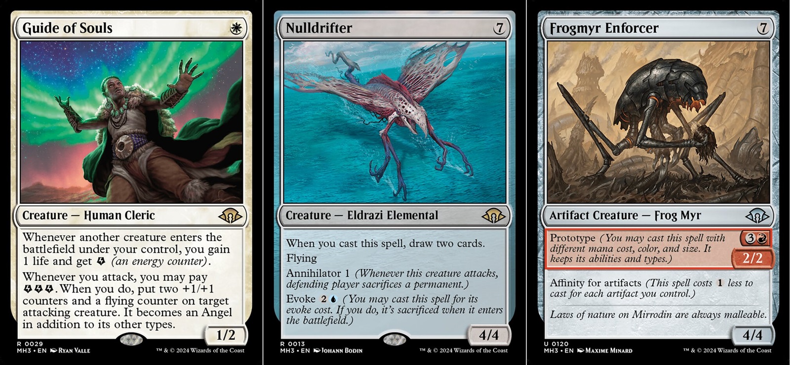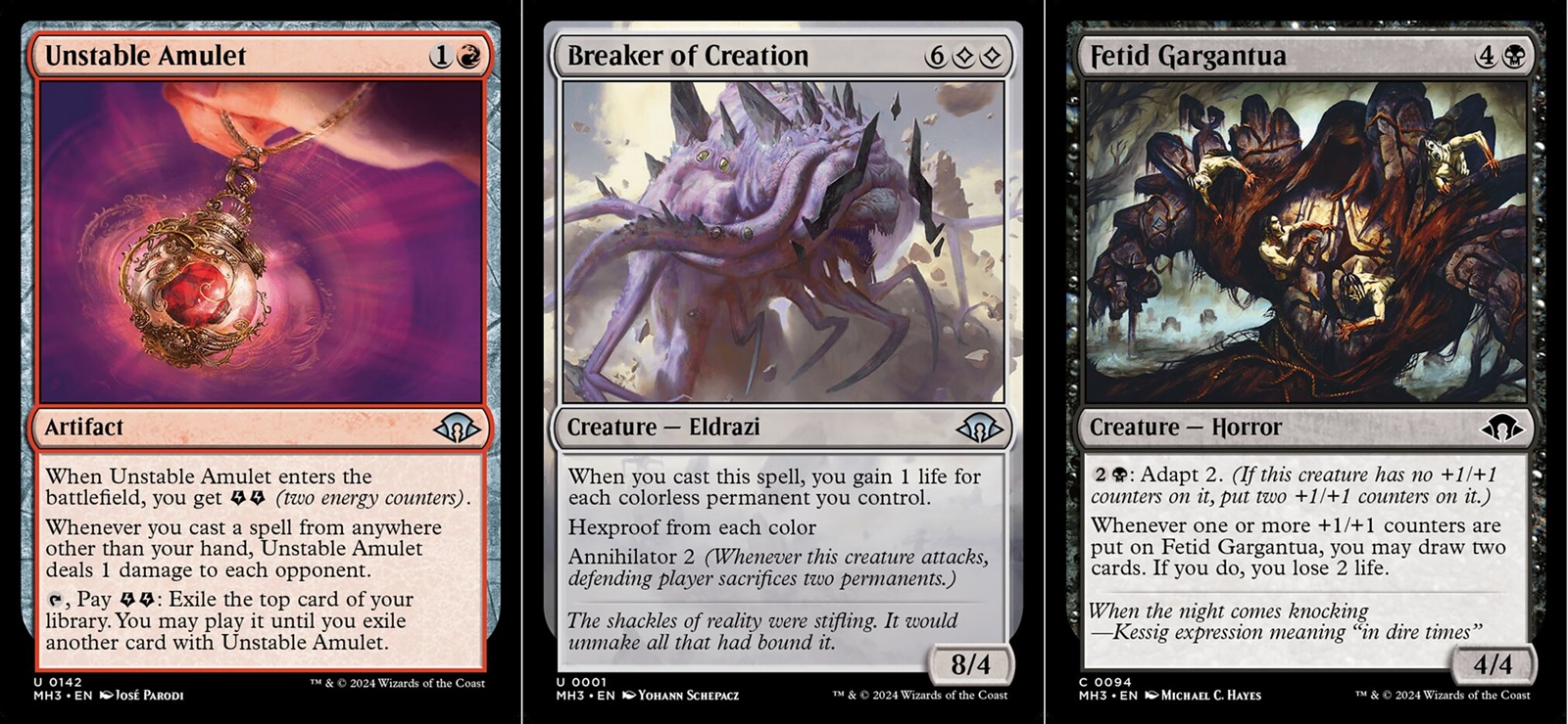 Normally I’d describe what a set’s new mechanics are, but MH3 doesn’t have any. Modern Horizons sets are built from the existing bones of Magic: The Gathering. MH3 has a LOT of mechanics within it (around 40 according to Wizards), but I will highlight ones that help define its draft environment. The big three themes are Energy, Eldrazi, and Modified. Energy is an additional resource cards can generate and you can use that energy for additional effects. Energy tends to support aggressive strategies in MH3. The Eldrazi are back, these Cthulhu inspired beings are associated with colorless mana and have high mana costs for very powerful creatures. The Eldrazi here represent decks that want to ramp their mana and play the long game so they can get their powerful creatures out. Modified isn’t any one specific mechanic, but is a game term for any creature that has a counter, is equipped, or has an aura attached to it (from its owner.) There’s a whole slew of creatures within MH3 that use counters for additional effects and these decks focus on manipulating their creatures to outpace their opponents. There’s a smaller theme around artifacts and blue based control deck, but you really have to steer yourself into those two for them to come up. Those three big themes are what you’ll commonly draft when playing with MH3.