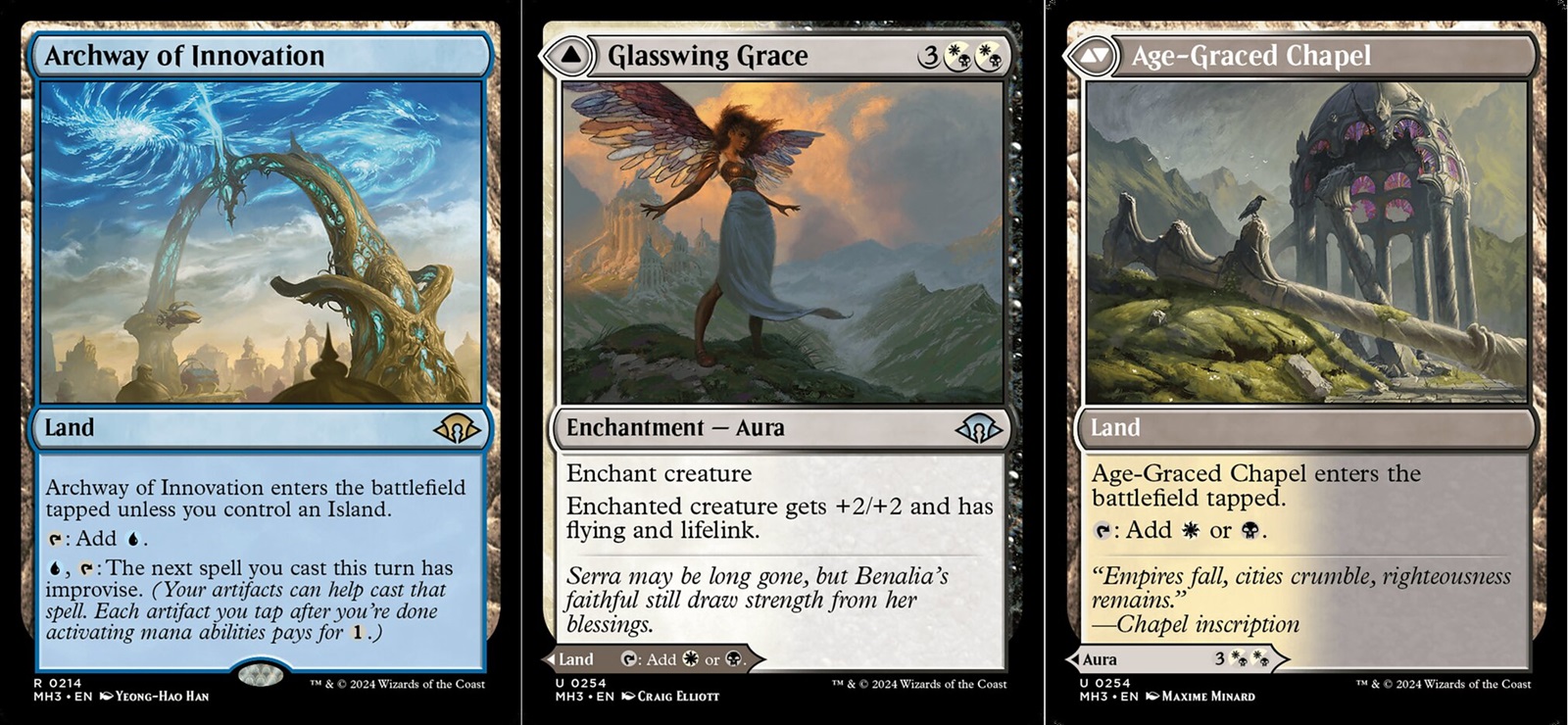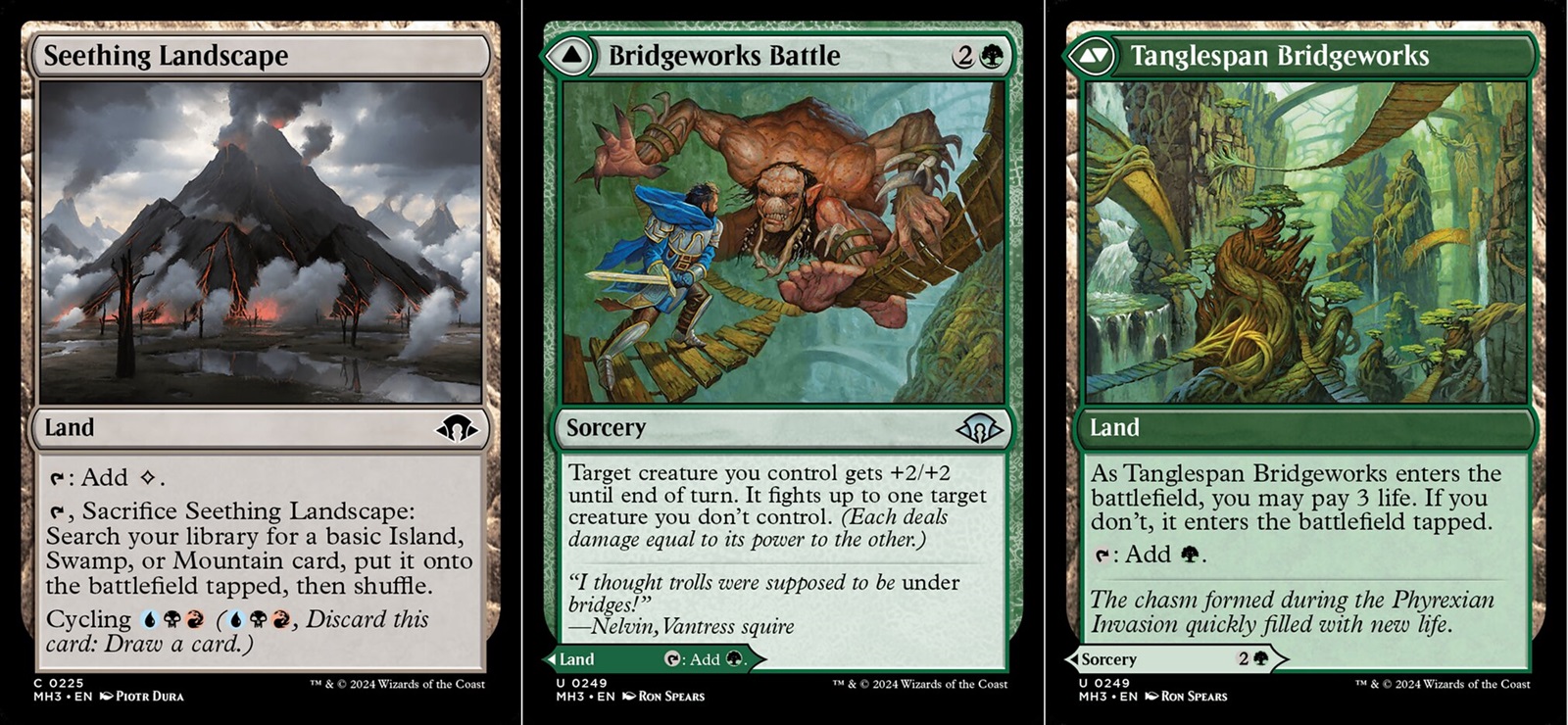The other big thing that helps define this draft format for me is the mana. Within MH3 you have an incredible amount of flexibility in your mana. The allied color fetchlands received a reprint here, but there are also multiple new land cycles. There are the brand new “Landscapes” which seem innocuous, but are incredible designs. These lands tap for colorless and can be sacrificed to find a tapped basic land in one of three colors, and they also cycle for one of each of those colors. Sitting alongside those lands are new modal double-faced lands that can be played as a land or as a spell and then there’s just new mono colored lands with powerful abilities. I know these don’t sound super exciting, but having these around help players into specific colors during draft. This in turn helps players signal during a draft and theoretically end up with better decks. In addition, if you’re struggling in a draft, these lands can be a lifesaver offering you the mana flexibility you need in that moment.