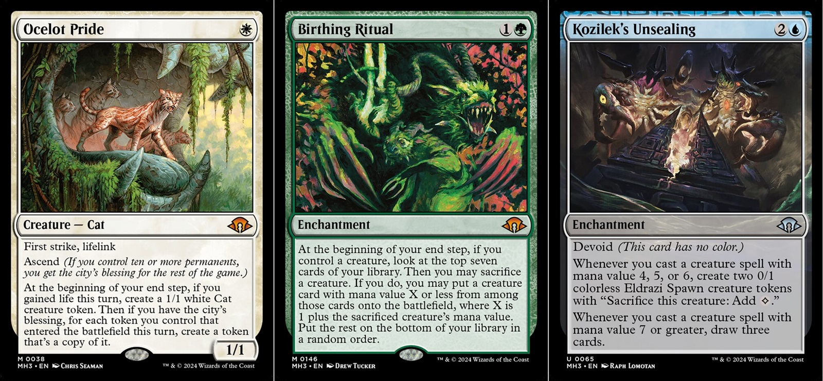 So I said this is one of the best draft formats I’ve experienced. Why is that? The cards feel carefully constructed to create fun decks to play. On a broad level I find nearly every draft archetype fun to play. This isn’t the case for all sets. Everyone has a preferred play style, but with MH3 I found myself happy to explore whatever colors the draft was throwing my way. The three big themes create a variety of gameplay that’s just fun to explore. Once winning strategies get identified in draft environments, you can come across too many of those decks making gameplay stale. Here that hasn’t happened for me and the wide variety of opponents kept the fun going. The individual cards within MH3 are interesting, fun to play, and powerful without feeling unfair. You can encounter aggressive decks attacking on turn one, normal “midrange” decks that hit their stride after the first few turns, or decks trying to hold out into the long game in hopes of casting those high cost Eldrazi.