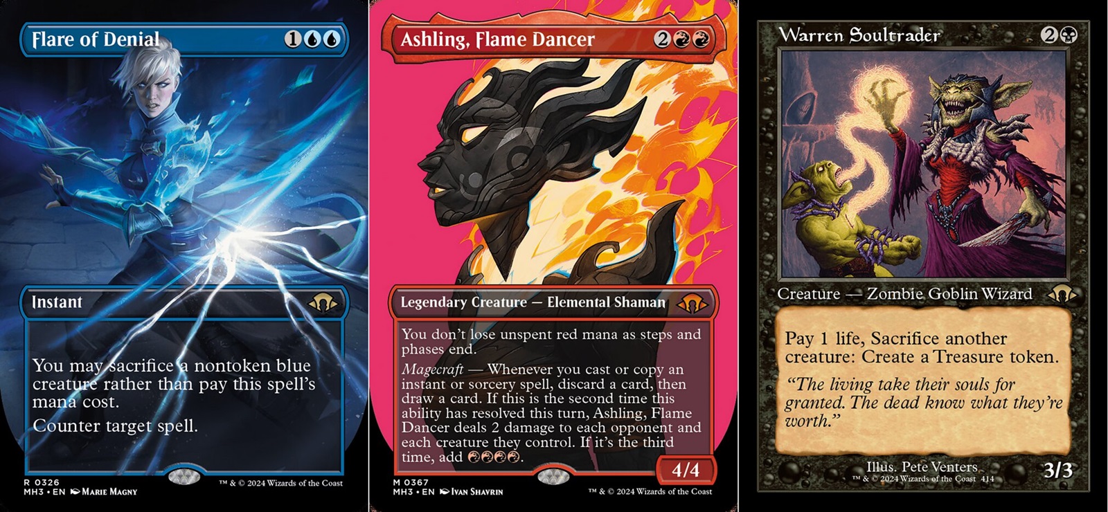 As for special artwork and treatments, MH3s borderless cards are particularly beautiful. I’m just going to leave a link to the Scryfall page for MH3. Just go look at some of them and imagine that they were instead a painting on a wall. You’d never even know it’s actually on a Magic card. Many of the legendary creatures in the set also receive special side portrait borderless frames too. Despite being very good, the side portrait versions are the ones I like the least. There’s also old border style cards too which I don’t personally care for. The old border frames make someone happy and that’s fine, but I like the “cleaner” look of the current card frames. Maybe that’s where MH3 felt too self indulgent for me.