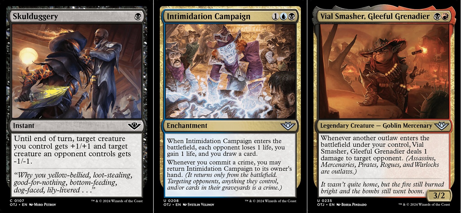 Let’s start by introducing you to the cool concept of crimes, cause you’ll be committing lots of them in Thunder Junction. New to MtG is the concept of “committing a crime”, for game purposes this means: using a spell or ability that targets an opponent, a permanent they control, a spell an opponent controls, or their graveyard. What does that actually mean? Basically any time you target an opponent and any of their stuff you’ve “committed a crime.” This was designed so that the rules of crime would be backwards compatible with the 30+ years of Magic. It is a strange concept that only cards that specifically target something count as a crime. Cards like Blasphemous Act that don’t target specific things are not a crime despite sure feeling like one. In terms of a new rule, crime is a bit of an odd duck as it’s a way of codifying something that is fundamental to MtG. This approach allows Wizards more flexibility in using crime as a future design element, but it’s now a part of Magic that we commit crimes all the time.
