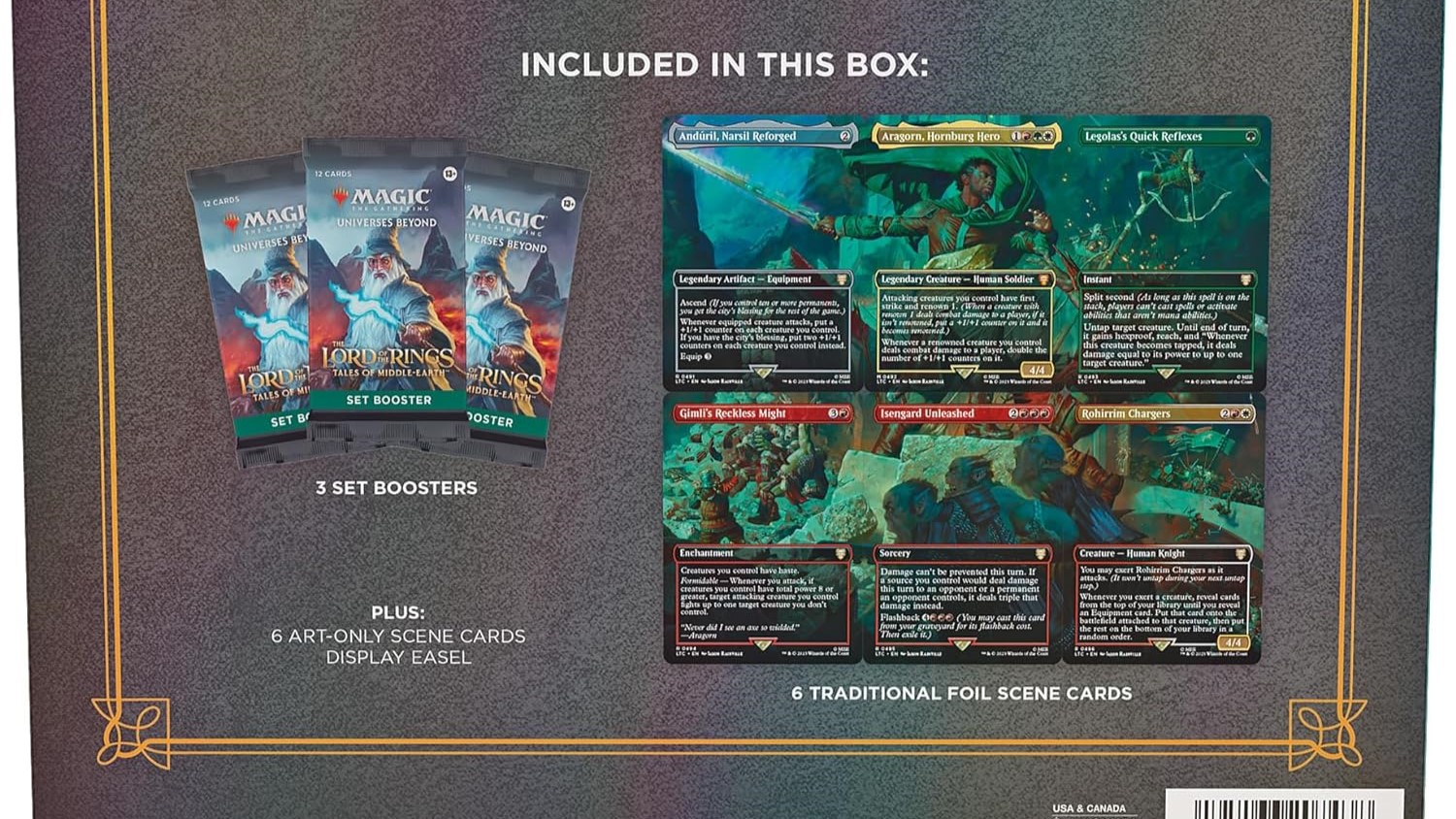 There are four Scene Boxes with each one depicting an important moment in the Lord of the Rings. The four boxes are: Aragon at Helm’s Deep, Flight of the Witch-King, The Might of Galadriel, and Gandalf in Pelennor Fields. Each box comes with six foil unique borderless panorama cards that can be combined to form the full scene for each box. These are similar to the borderless panorama cards found in the main Tales of Middle-earth set (LTR), but this time you don’t have to hunt for the cards for the panorama, you get them all in one box together. In addition to the six panorama cards you’ll also find three Tales of Middle-earth Set Boosters (LTR), six art cards identical to the scene cards, and a cardboard display easel. The art cards can be displayed instead of the scene cards to form the panorama, but I’m not sure why you would do that considering the full scene is also on the back of the display easel. The main draw to this product is that you know what six cards you are getting with the rest of the additions largely being a bonus.